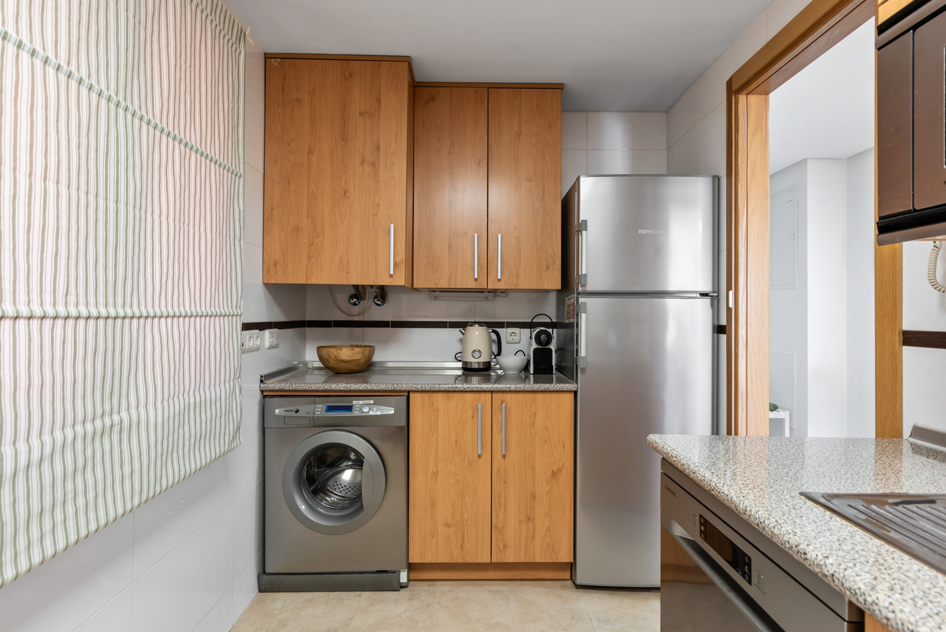 Tilbyder terrassemøbler, terrasse 5 m², vaskemaskine, strygejern, internet (wifi), hårtørrer, altan, børneområde, fitnesscenter, spa, centralvarme, aircondition, swimming pool communal infantile, garage og parkeringshus til den samme bygning, 1 TV.