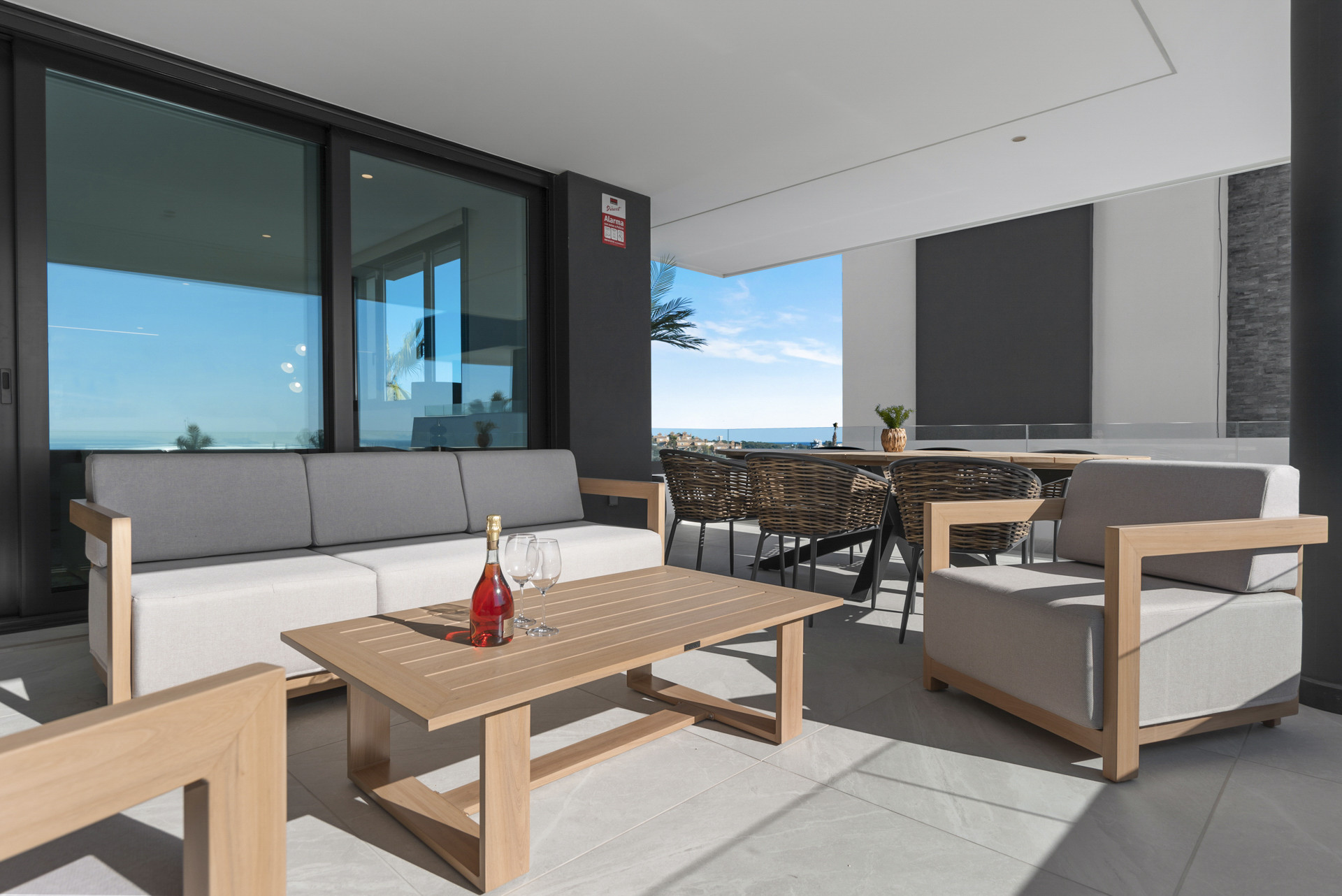 Højdepunktet i denne fantastiske bolig er dens private terrasse, hvor du kan slappe af og nyde middelhavets solskin, mens du nyder en betagende udsigt over de fælles haver, mousserende swimmingpool og det azurblå vand i Middelhavet.