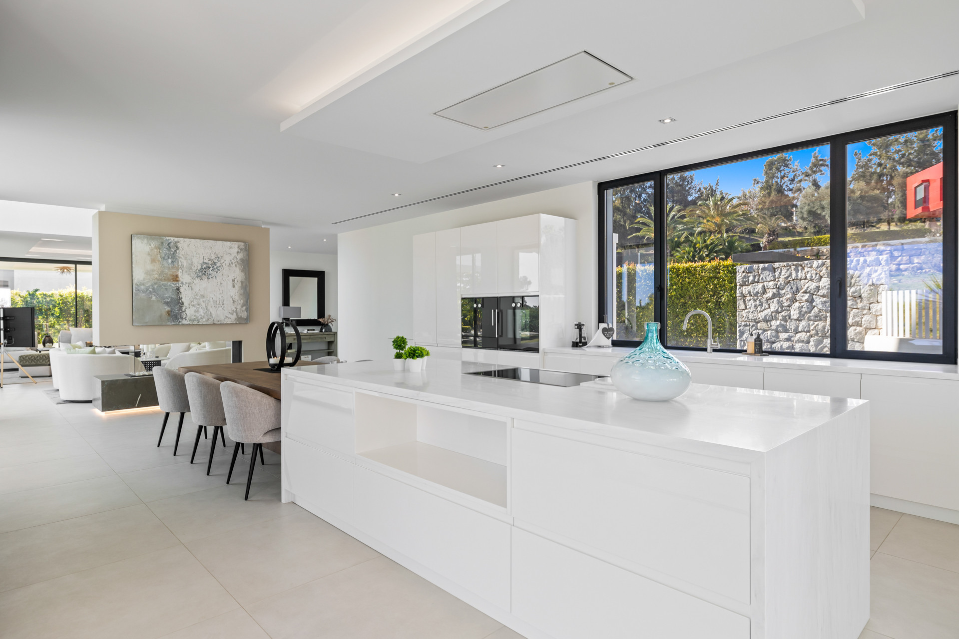 Det rummelige og fuldt udstyrede køkken er i topklasse og har en drømmende åben planløsning, der kombinerer en spiseplads. Elegante hvide skabe, hvide marmor bordplader, lyse fliser samt topmoderne hårde hvidevarer. Uden sidestykke, når det kommer til at udforske dine yndlingsopskrifter!