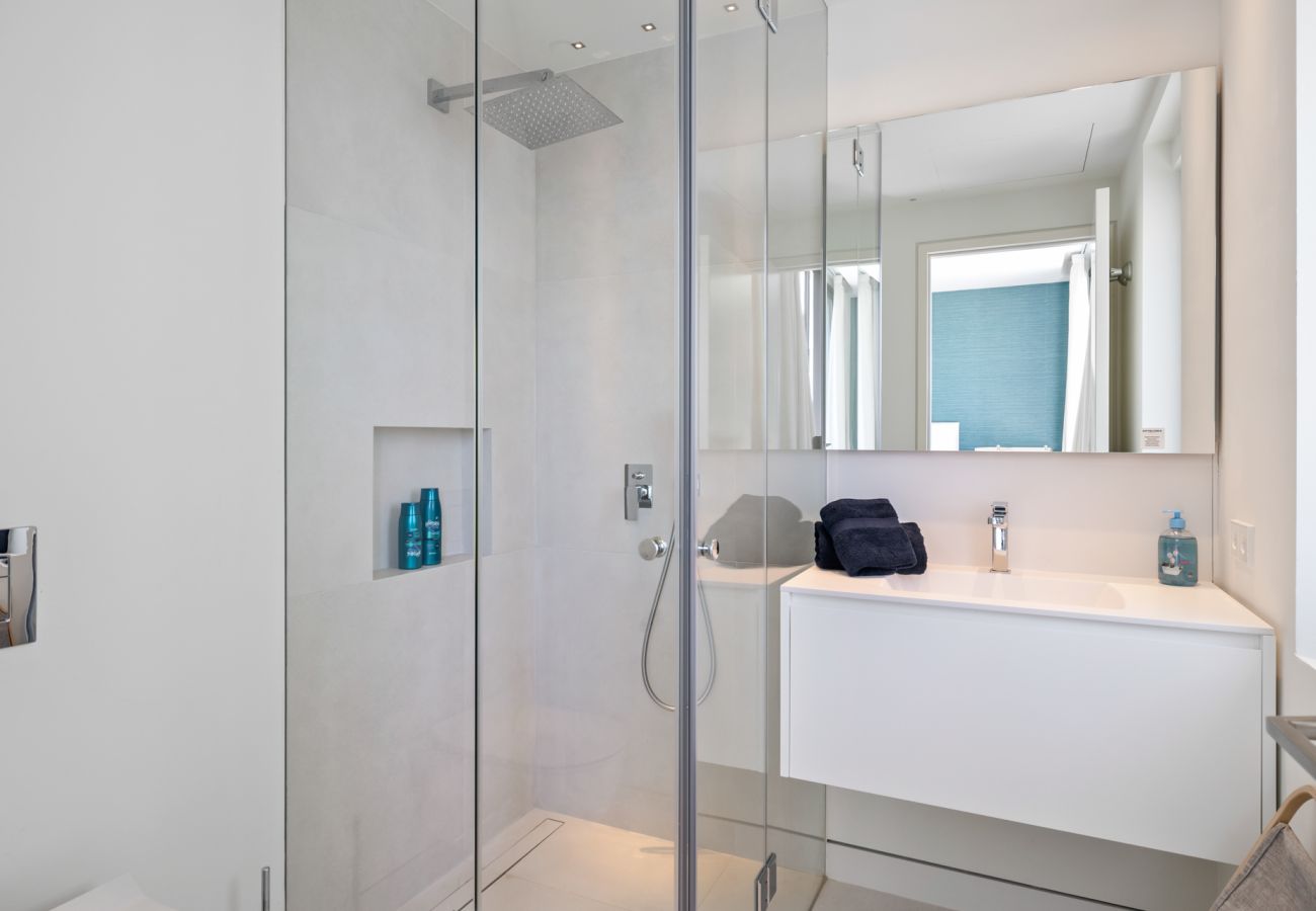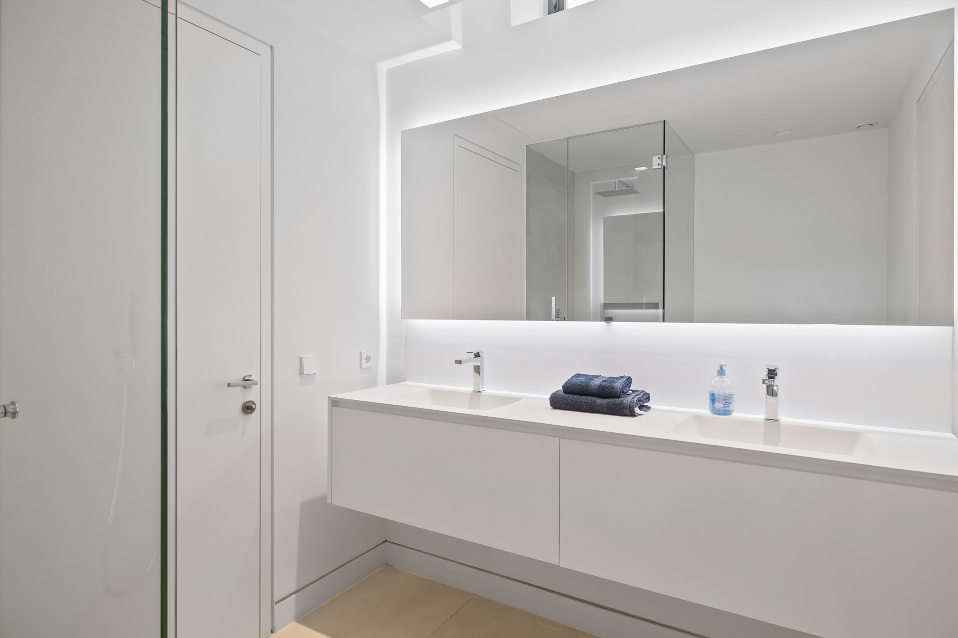 Indvendigt er villaen omhyggeligt designet med en blanding af varme, indbydende dekorationer og sleek, moderne finish. Husets venstre fløj rummer to stilfulde soveværelser, hver udstyret med 180 cm senge og SMART vægmonterede TV'er, som deler et moderne badeværelse med badekar/bruserkombi. Et dedikeret arbejdsområde med skrivebord og kontorstol tilbyder et fredeligt miljø med rolig haveudsigt, hvilket gør det ideelt til hjemmearbejde eller stille fordybelse. Øverste etage, kaldet Family Floor, huser to yderligere soveværelser. Et værelse har en 180 cm seng og et arbejdsområde, mens masterbadeværelset er et luksuriøst tilflugtssted med walk-in-garderobe, en privat terrasse med betagende udsigt og et elegant badeværelse med jacuzzi-badekar og standing shower. Masterbadeværelset er møbleret med en 180 cm seng samt en ekstra 140 cm seng, hvilket sikrer fleksible sovemuligheder.