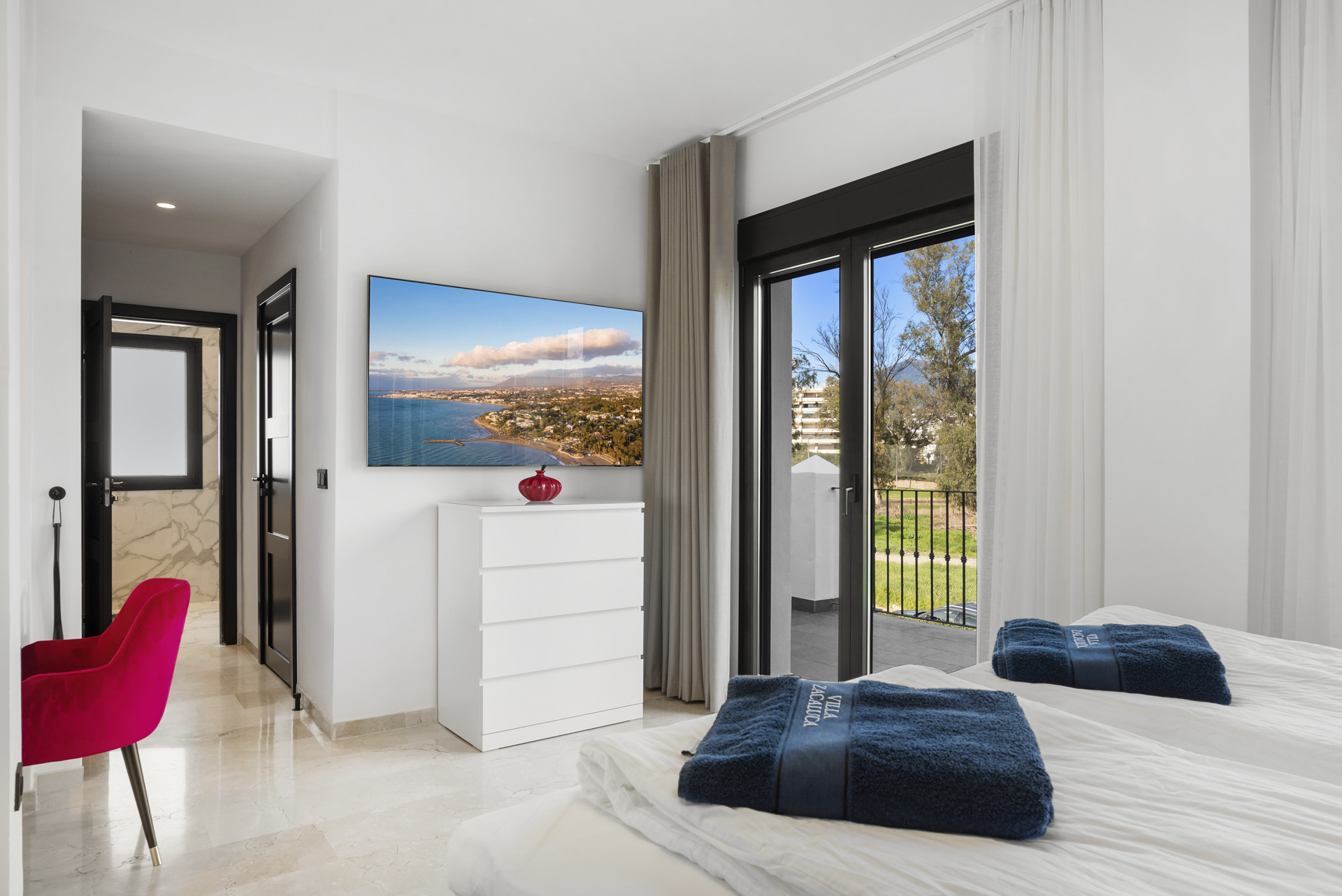 Indvendigt byder villaen på smukt indrettede soveværelser med luksuriøst sengetøj og moderne badeværelser med eget bad, som er udført i marmor og høj kvalitetsmaterialer. Hvert rum er omhyggeligt designet for at sikre privatliv, komfort og behagelig søvn. Aircondition i hele ejendommen sikrer en behagelig temperatur hele året rundt.