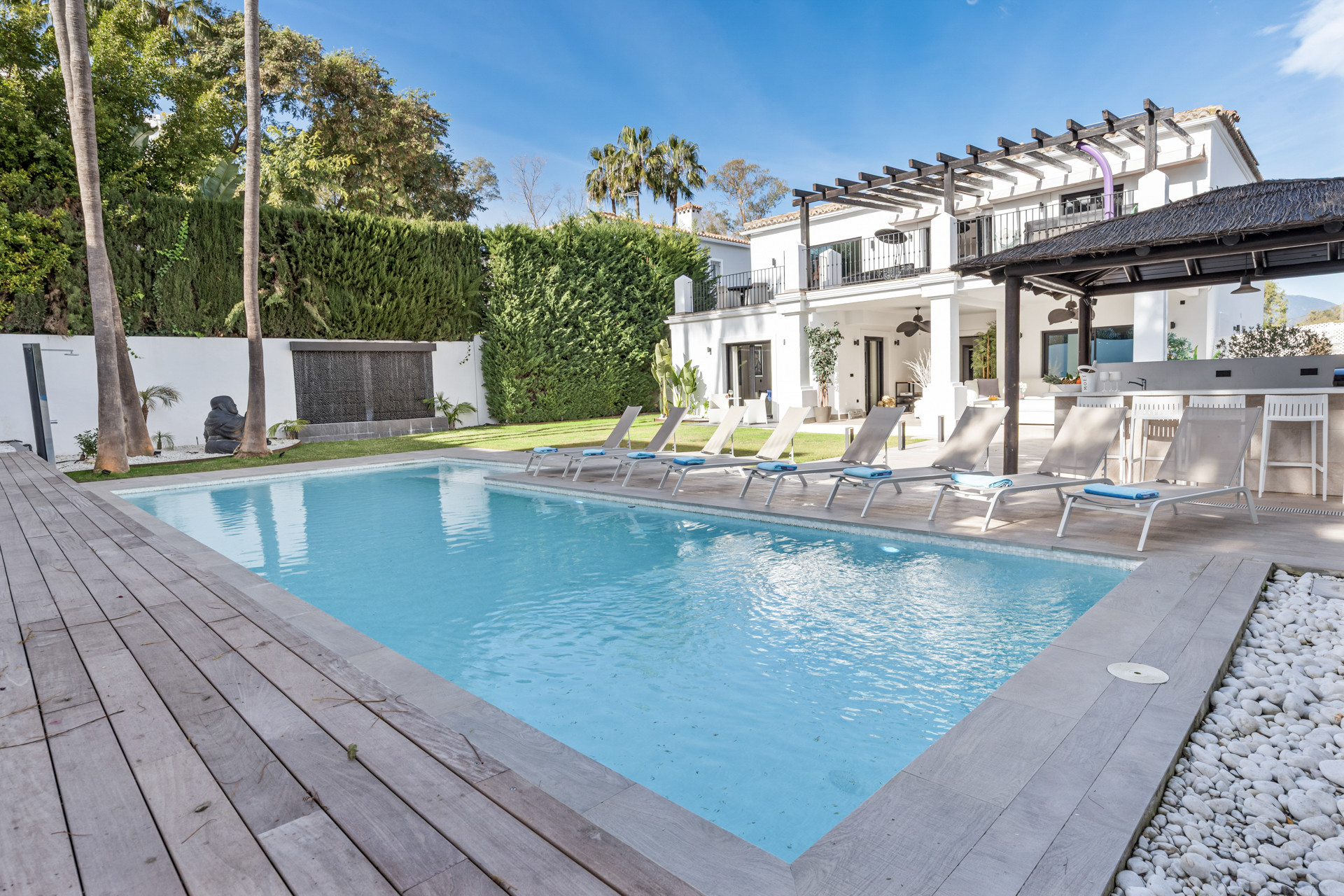 Den landskabelige have er fuldstændig privat og smukt vedligeholdt, med palmer, citrusfrugttræer og elegant belysning, der skaber en rolig feriestemning. Uanset om man slapper af på den skyggelagte loungeтеррasse, nyder et glas vin ved poolen eller afholder en middag ved solnedgang, er hver en krog af ejendommen designet til komfort og nydelse.