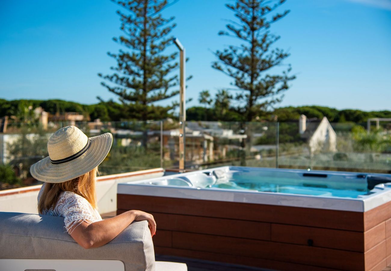 The living area is outfitted with a spacious L-shaped sofa, an indoor dining table, and a fully equipped kitchen. The terrace boasts chic furniture, including a comfortable chill-out lounge, a stylish wood-topped dining table, sunbeds, and a BBQ, perfect for alfresco dining and relaxation.