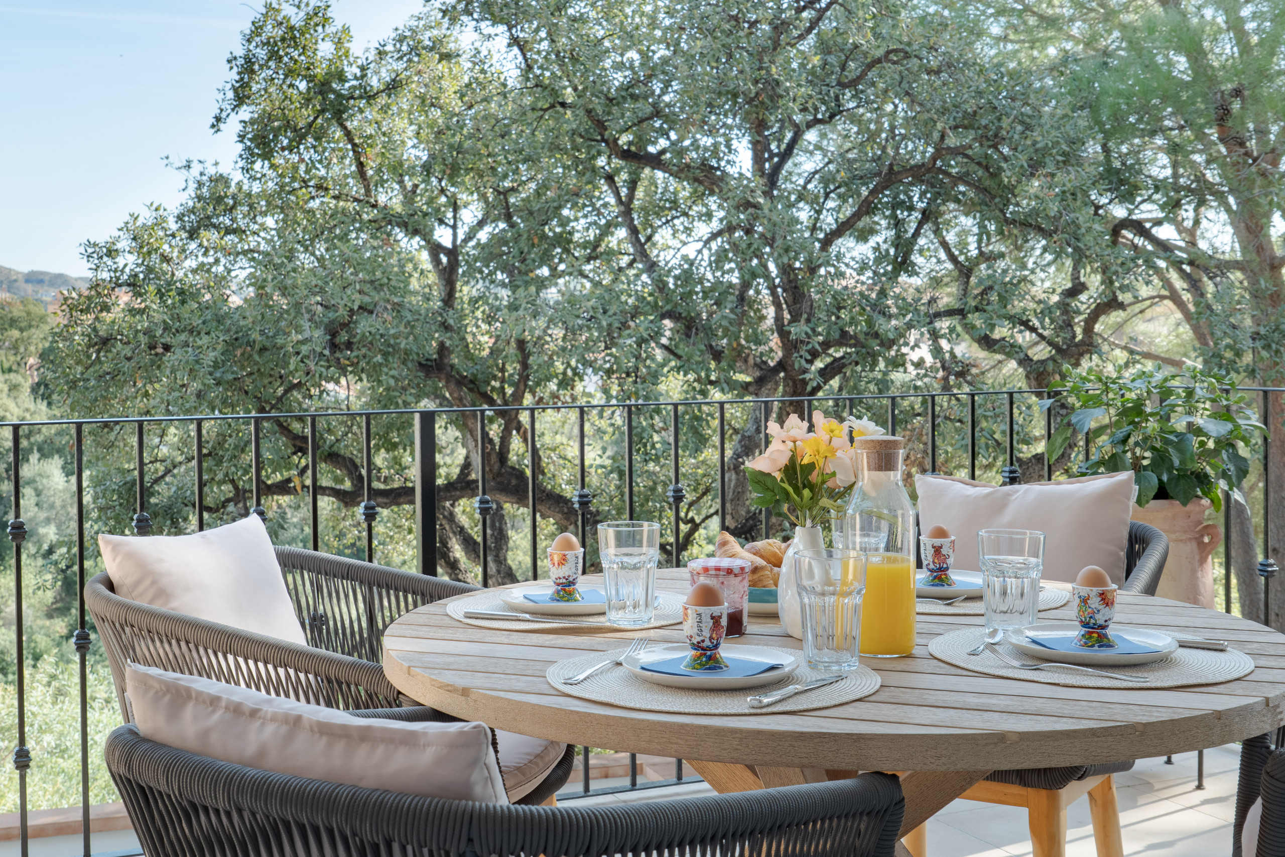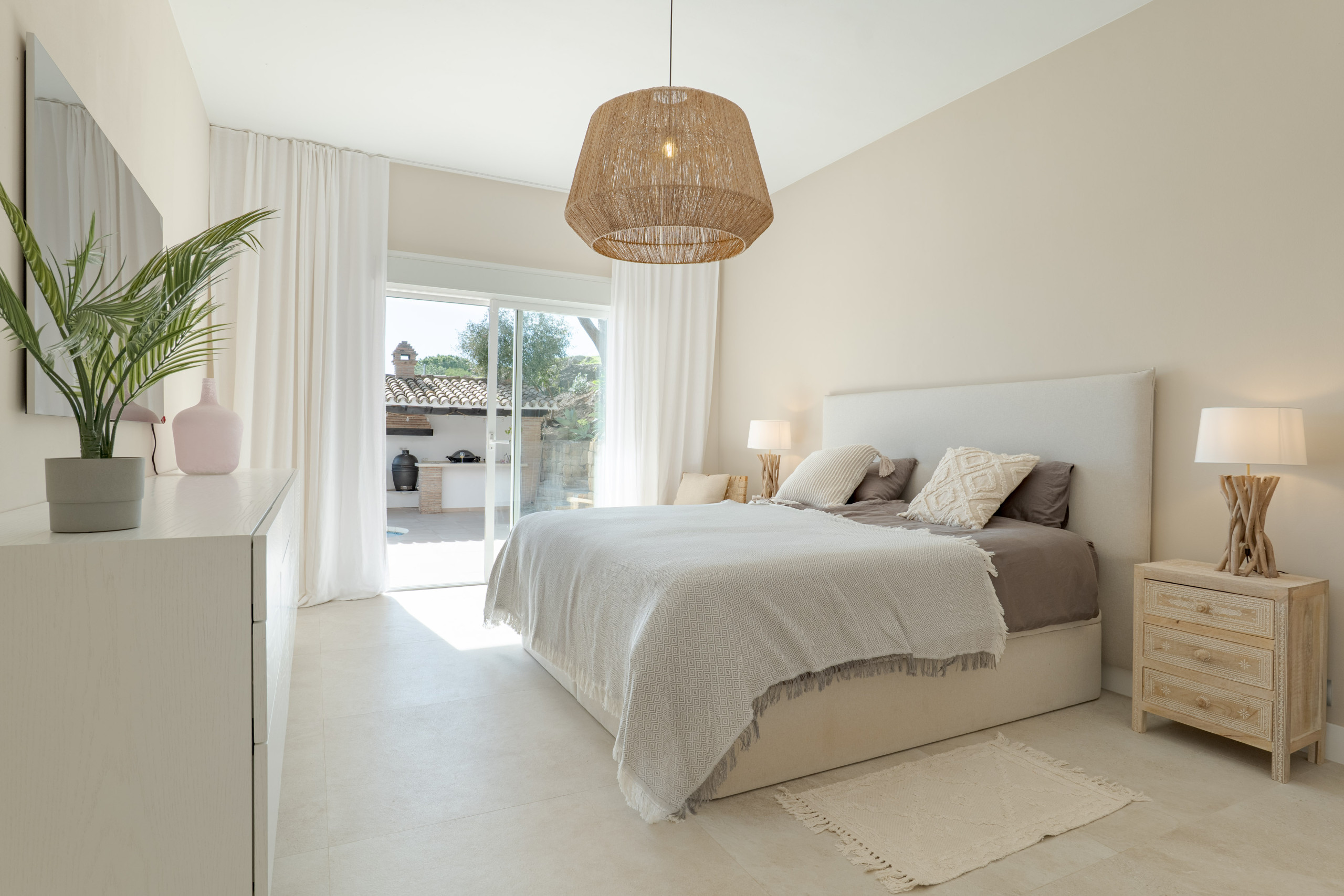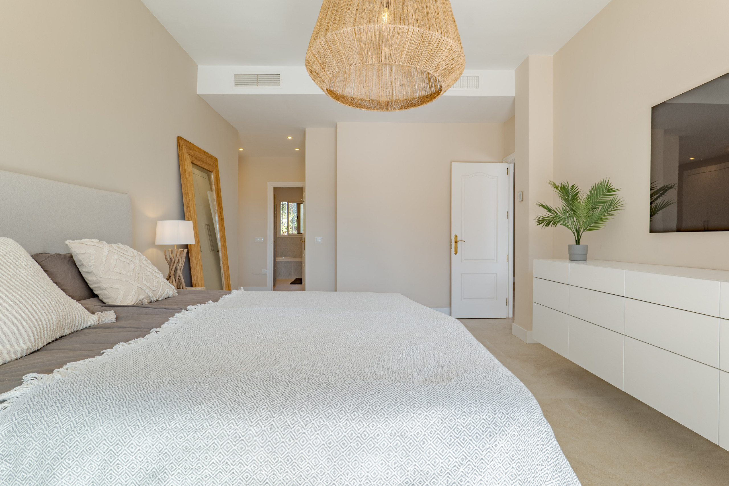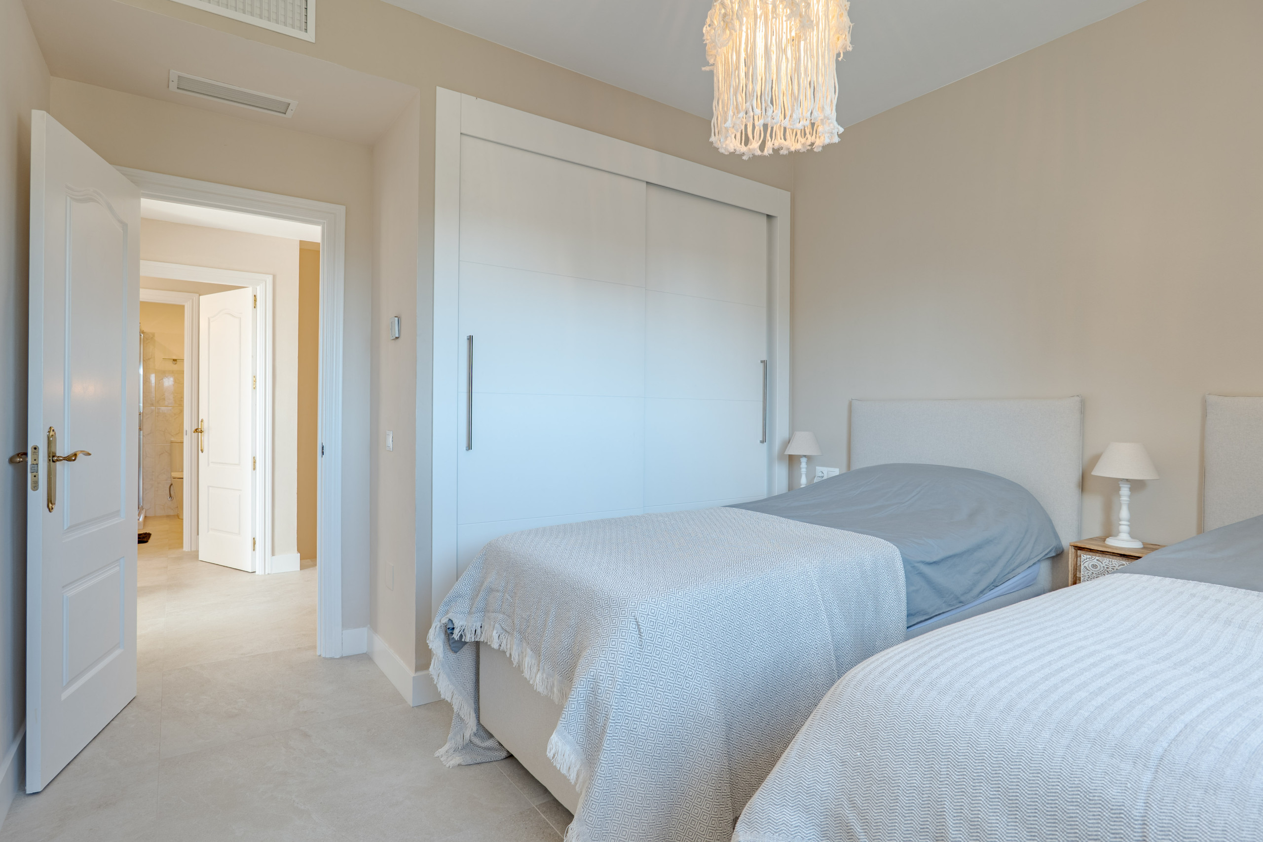 Villaen har fire rummelige soveværelser, alle med indbyggede garderober. Tre soveværelser har eget badeværelse, mens det fjerde soveværelse har et separat privat badeværelse, hvilket giver fremragende komfort og privatliv for familier eller vennegrupper. Et ekstra gæstetoilet tilføjer yderligere bekvemmelighed.