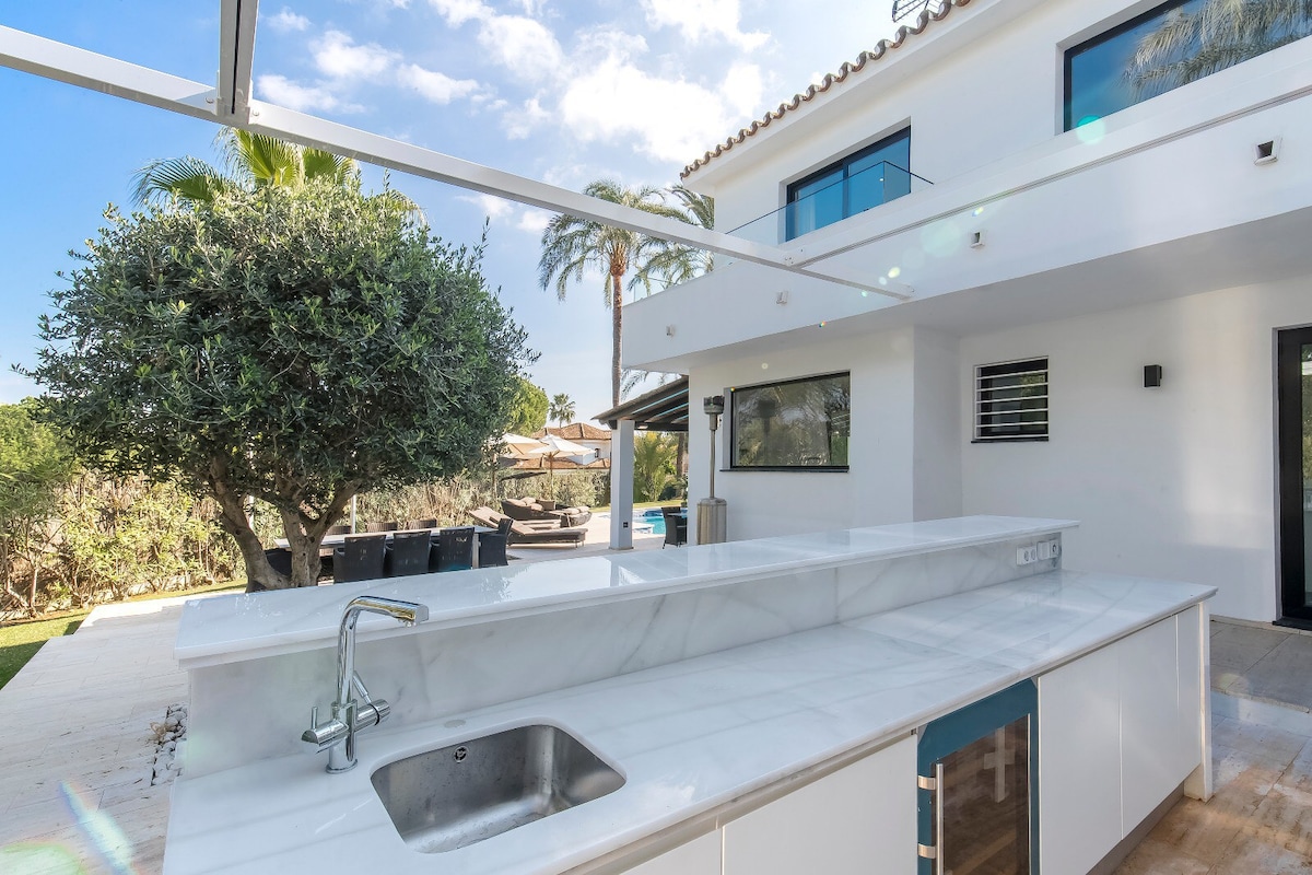 Velkommen til Villa Sina! Gemt væk i den eftertragtede bebyggelse El Rosario i Marbella er Villa Sina en charmerende blanding af traditionel spansk design og moderne komfort. Denne 5-værelses ejendom er perfekt til familier eller grupper og tilbyder en fleksibel indretning med et hovedhus og en separat gæstelejlighed. Med tre soveværelser i hovedhuset og to mere i den selvstændige lejlighed er det en ideel opsætning til at huse familie og venner, samtidig med at privatlivet bevares.