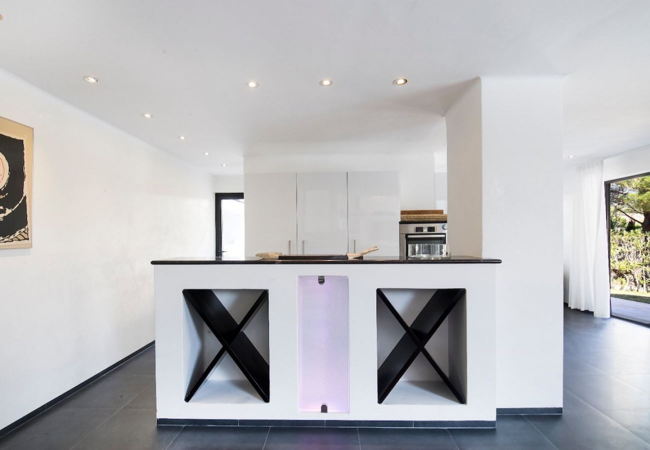 Fra køkkenområdet er der direkte adgang til den udendørs terrasse og poolområde.