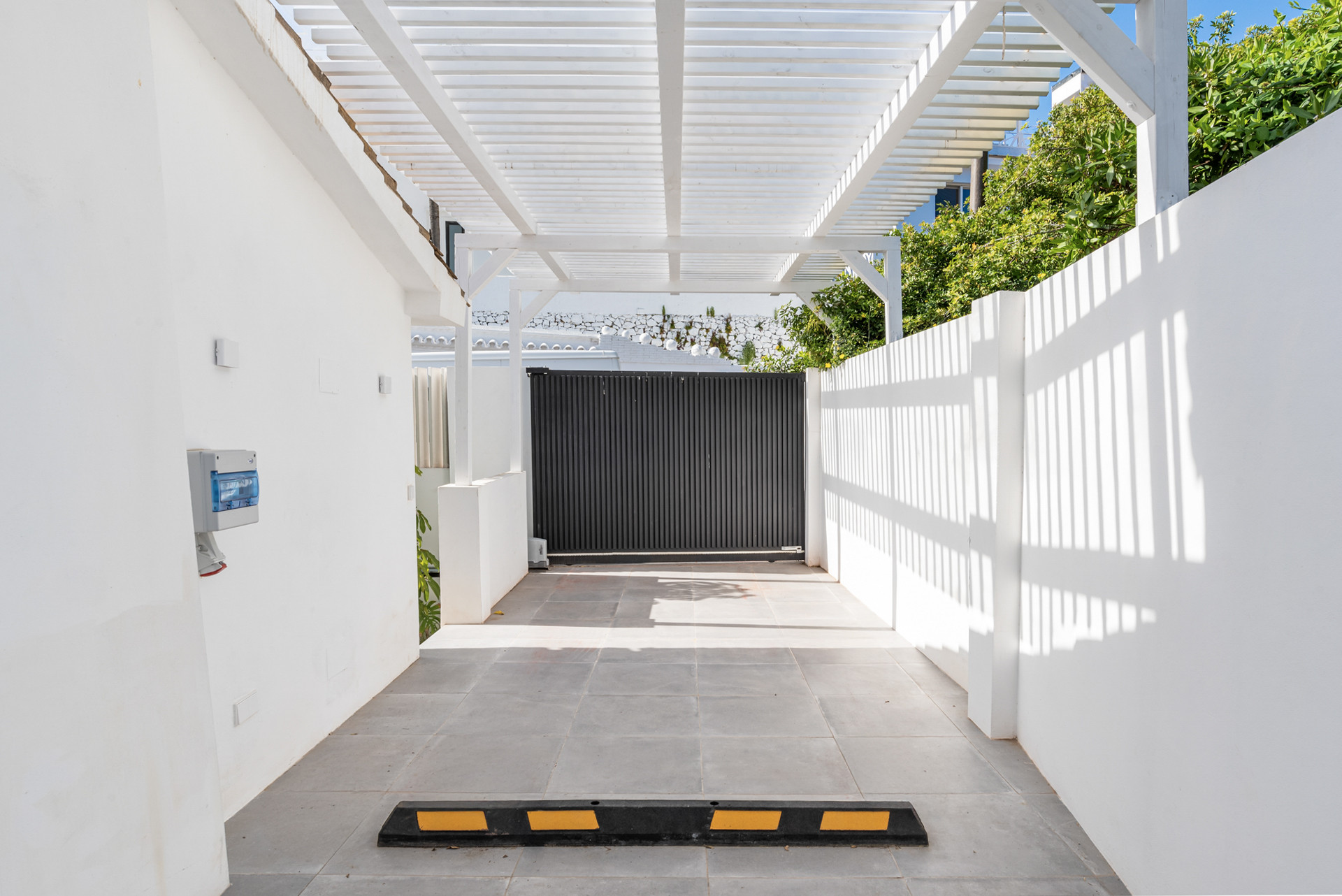 Gå udenfor for at nyde velholdte haver og rolige rum designet til afslapning. Poolen er omgivet af frodig grøn vegetation og suppleret med skyggefulde spise- og loungeområder - perfekt til eftermiddagsafslapning eller aftenhygge. En carport med en elektrisk køretøjsopladningsstation gør dit ophold nemmere, mens et sikkert alarmsystem giver ekstra tryghed.