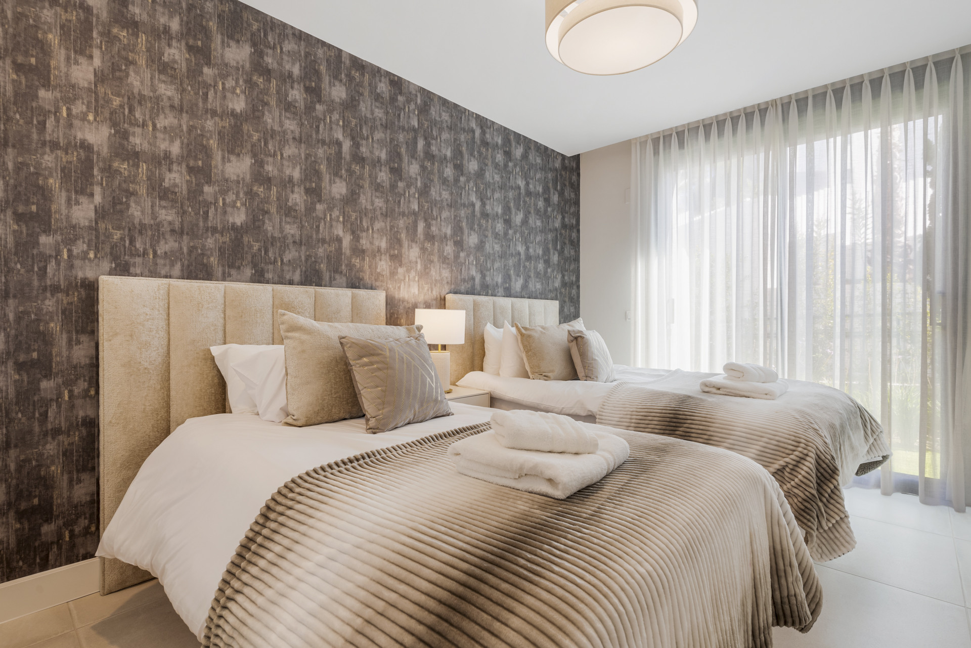 Die Schlafzimmer sind großzügig bemessen und bieten ein Refugium des Komforts mit üppiger Bettwäsche, eingebauten Kleiderschränken und großen Fenstern, die Garten- oder Meerblick bieten. Das Hauptschlafzimmer mit direktem Terrassenzugang ist der perfekte Ort, um friedliche Morgen zu genießen. Die spa-inspirierten Badezimmer sind ebenso beeindruckend, mit begehbaren Duschen, Doppelwaschbecken und hochwertigen Armaturen, die einen luxuriösen Rückzugsort im Haus bieten.