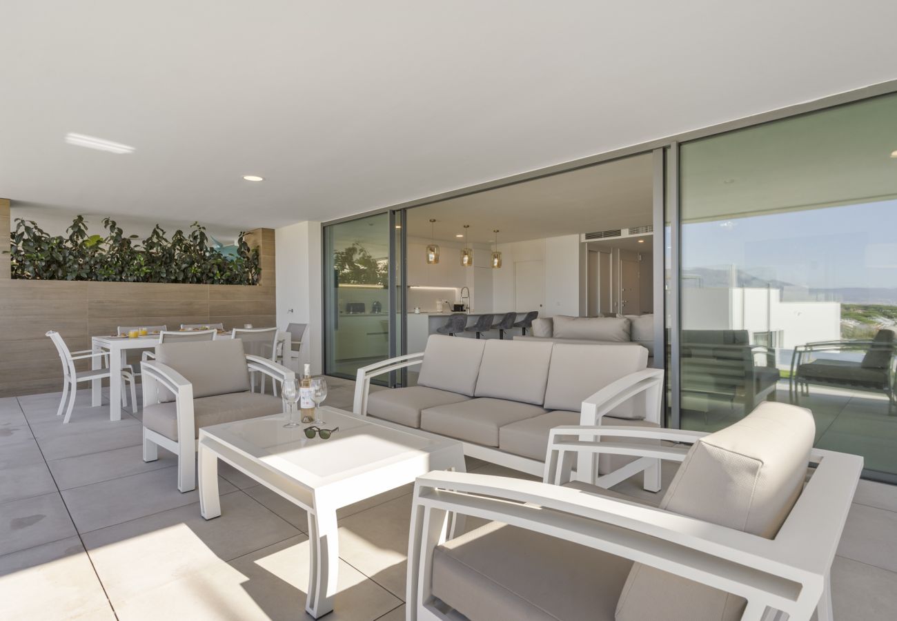 Willkommen in Casa Mariposa! Eingebettet in der renommierten Artola Homes II-Entwicklung in Marbella bietet diese beeindruckende Immobilie eine perfekte Mischung aus Luxus, Komfort und atemberaubenden Küstenblicken. Die Wohnung verfügt über ein modernes und offenes Design, mit einem lichtdurchfluteten Wohnbereich, der von bodentiefen Schiebetüren aus Glas umrahmt ist. Das elegante und geräumige Interieur verfügt über ein zeitgenössisches L-förmiges Sofa, edle Möbel und einen nahtlosen Zugang zur geräumigen Terrasse, was sie ideal für Entspannung und Unterhaltung macht. Die hochmoderne Küche ist mit einer zentralen Insel, Barbestuhlung, hochwertigen Geräten und reichlich Stauraum ausgestattet und wurde sowohl für Stil als auch für Funktionalität konzipiert.