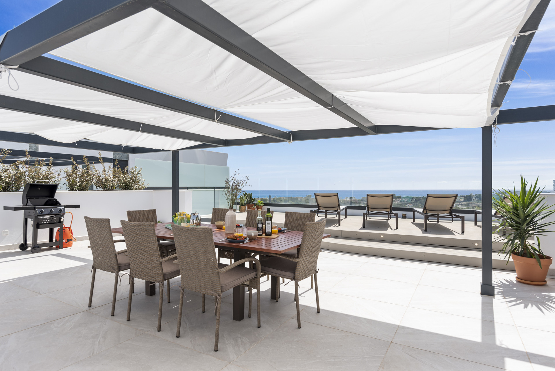 From here you have a staircase leading to the Rooftop Terrace with outstanding views of the pools and gardens, on to the Med, with the backdrop of majestic mountains. There is an array of sunbeds, a dining table and BBQ, and a chillout zone – the perfect space to enjoy at any time of day.