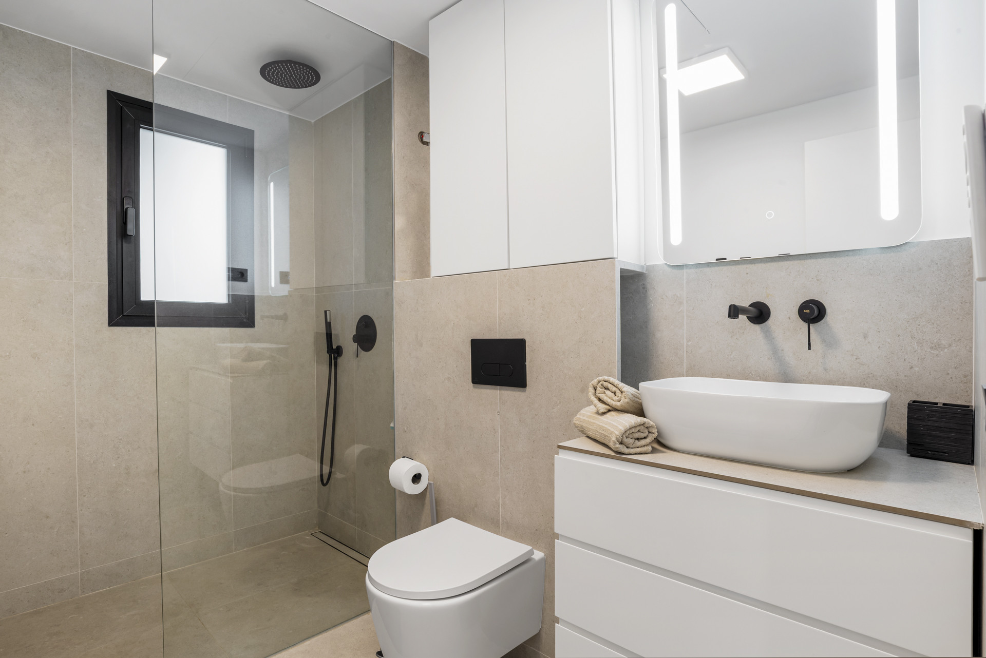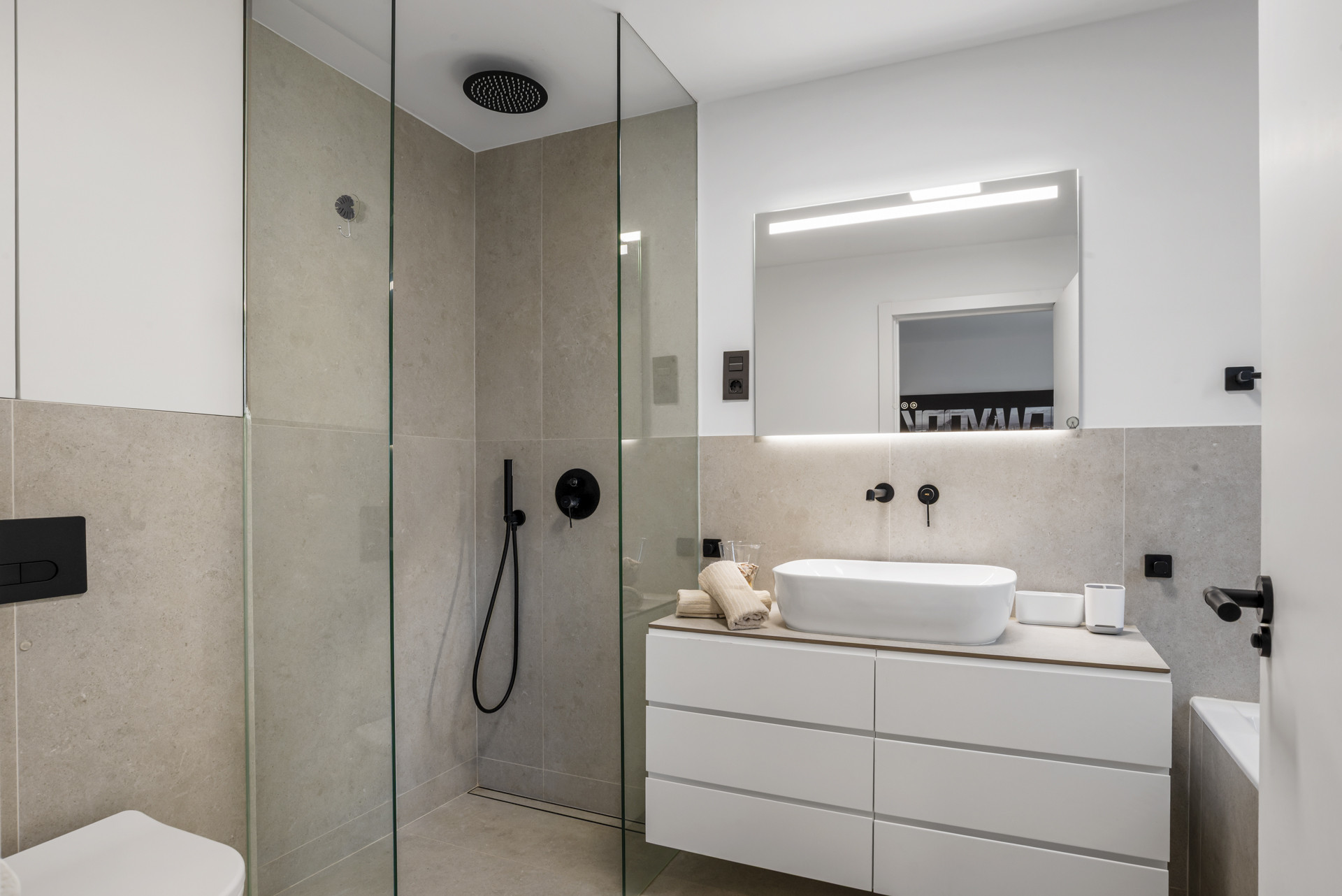 Die obere Etage beherbergt alle drei Schlafzimmer. Das Hauptschlafzimmer verfügt über ein eigenes Badezimmer mit Regendusche, Fernseher und einem privaten Balkon. Das zweite Schlafzimmer bietet Zwillingsbetten, während das dritte Schlafzimmer ein Einzelbett und einen separaten Arbeitsbereich bietet — ideal für Gäste, die remote arbeiten. Diese beiden Zimmer teilen sich ein modernes Badezimmer mit einer begehbaren Dusche.
