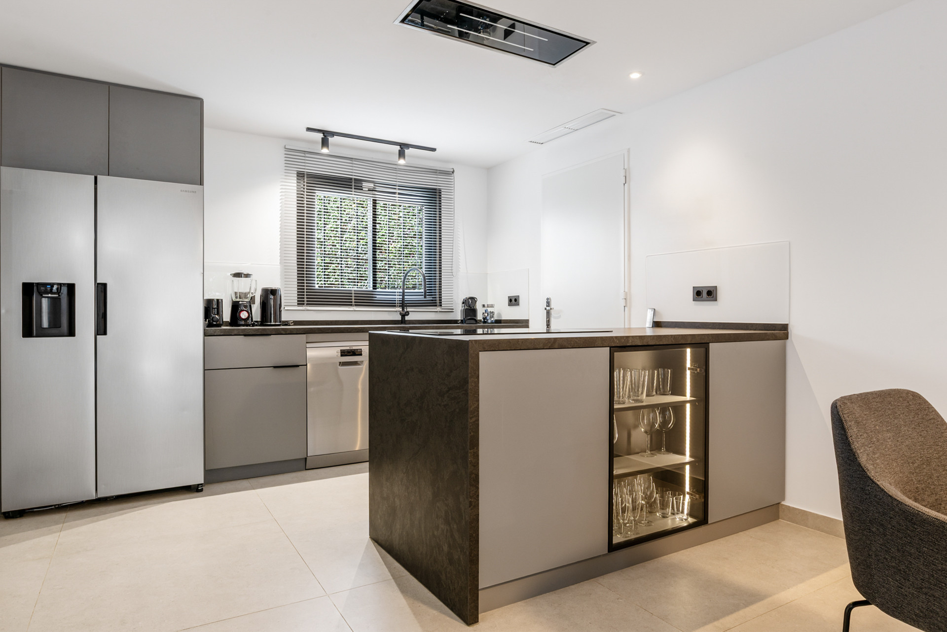 Im Erdgeschoss finden Sie einen hellen, offenen Wohn- und Küchenbereich mit einer stilvollen Theke. Die Küche ist vollständig ausgestattet mit hochwertigen Geräten, während der Wohnbereich bequeme Sitzgelegenheiten für sechs Personen und einen großen Smart-TV bietet. Schiebetüren führen zu einer großzügigen Terrasse mit einem Essbereich im Freien und gemütlichen Lounge-Sitzgelegenheiten und bieten direkten Zugang zu den wunderschön gepflegten Gemeinschaftsgärten und einem großen Swimmingpool.