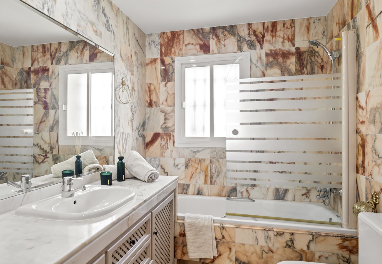Villa Aguacate ist eine atemberaubende 4-Schlafzimmer (5-Bett) Villa mit 350 qm, eingebettet in die ruhige Wohnanlage El Paraiso in Marbella. Sie bietet die perfekte Verschmelzung von andalusischem Charme und zeitgenössischem Design und ist ideal für diejenigen, die Komfort, Ruhe und moderne Annehmlichkeiten suchen. Kürzlich renoviert, verfügt die Villa über einen hellen und geräumigen Wohnbereich, der nahtlos auf eine malerische Terrasse mit Blick auf den üppigen Garten und den funkelnden Salzwasserpool übergeht. Ein überdachter Außenessbereich schafft die perfekte Kulisse für Mahlzeiten im Freien, während die vollausgestattete, neu gebaute moderne Küche hochwertige Geräte, einschließlich eines Doppelkühlschranks, bietet und somit ausreichend Stauraum und Komfort für Gäste gewährleistet.