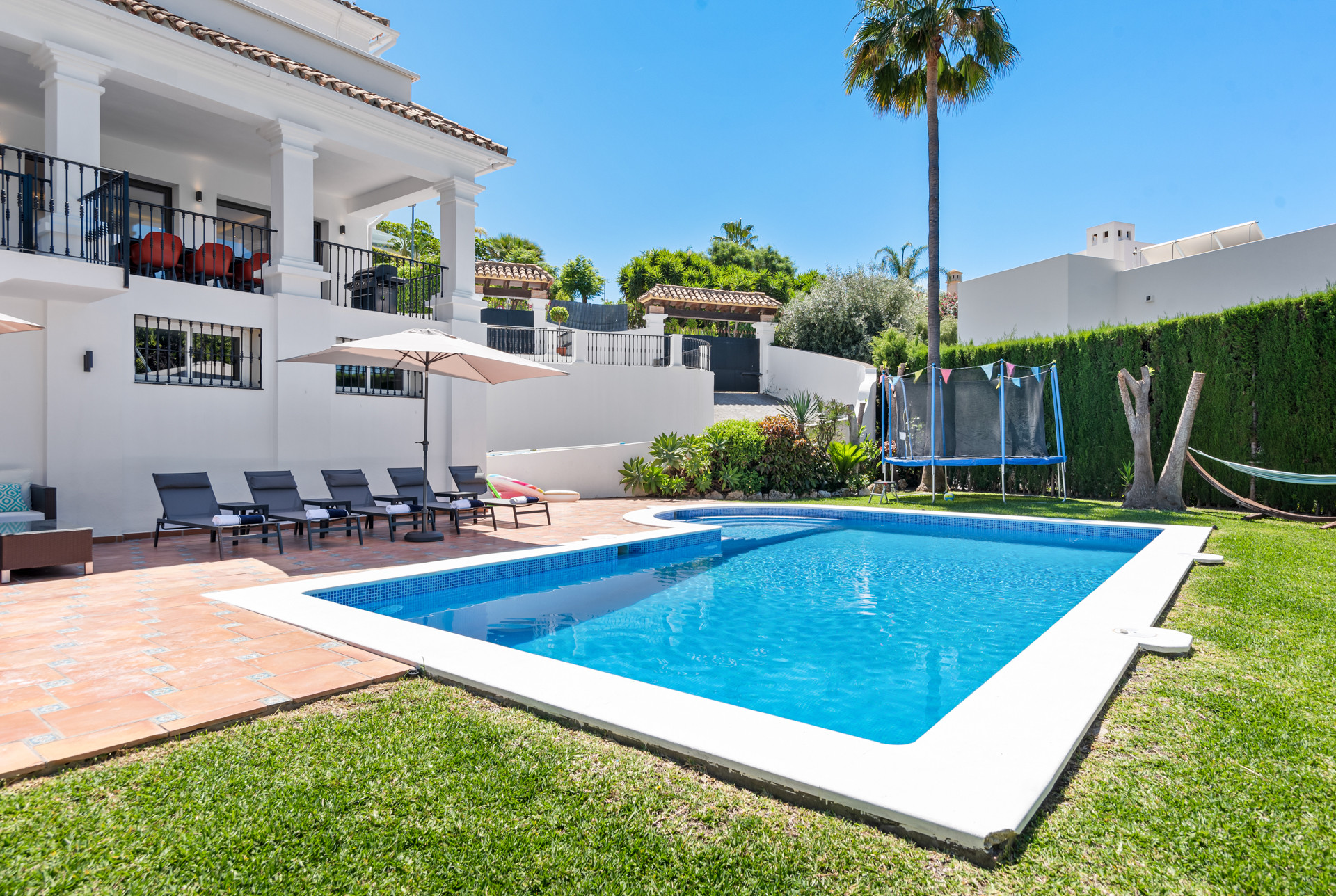 Eingebettet in eine private Wohnanlage in einer der begehrtesten Lagen von Marbella, bietet Villa La Alquería eine perfekte Balance zwischen modernem Komfort und mediterranem Charme. Diese stilvolle 4-Schlafzimmer-Villa bietet atemberaubende Ausblicke über den Alquería Golfplatz und den ikonischen La Concha Berg und schafft so eine ruhige und luxuriöse Unterkunft für Familien und Gruppen.