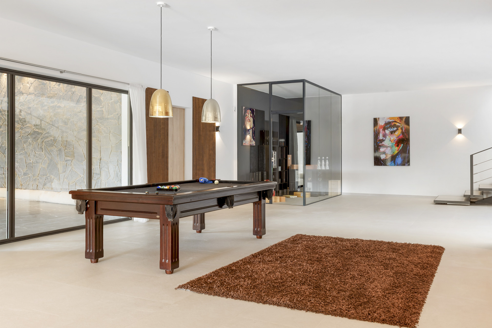 Die Unterkunft verfügt über ein umzäuntes Grundstück, eine Terrasse, eine Waschmaschine, einen Trockner, einen Grillplatz, einen Kamin, ein Bügeleisen/-brett, einen Zimmersafe, ein Internetanschluss (WLAN), ein Föhn, ein Balkon, ein Fitnessraum, eine Alarmanlage, ein SPA-Bereich, eine Zentralheizung, eine Klimaanlage, ein Privatpool, eine Garage (3 Stellplätze) auf dem Grundstück, ein Fernsehgeräte.