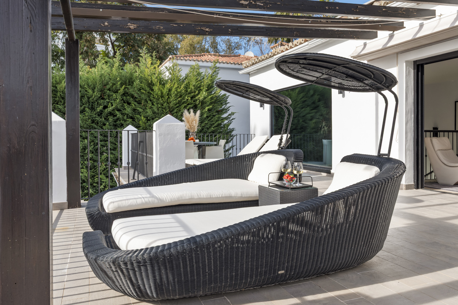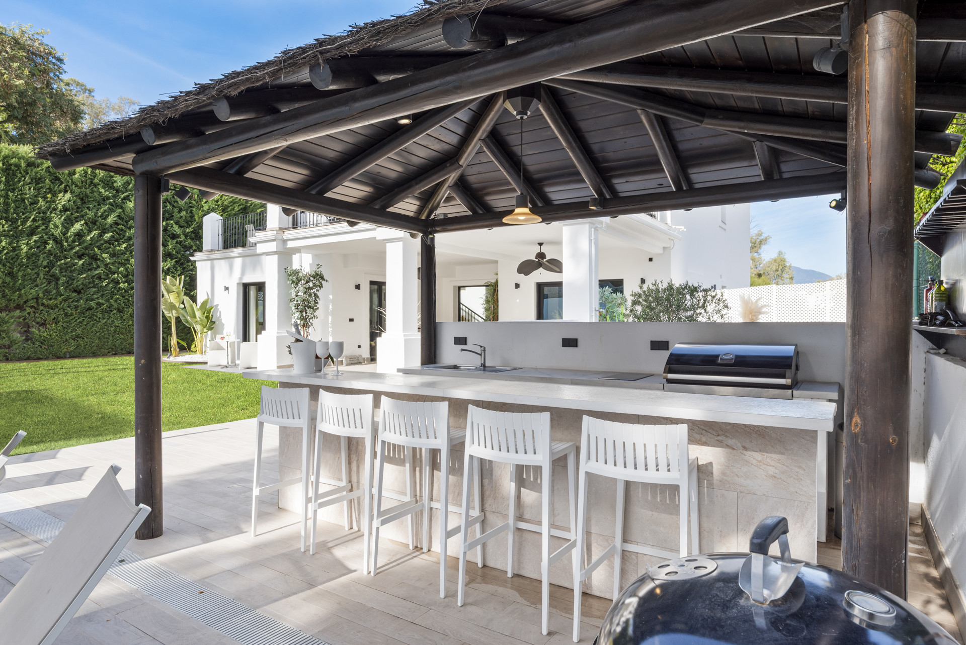 Draußen strahlt die Villa wirklich. Der private Swimmingpool ist von Sonnenliegen und üppiger Vegetation umgeben und bietet eine ruhige Oase zum Sonnenbaden und Abkühlen an warmen Tagen. Für ganzjährige Bequemlichkeit kann der Pool auf Anfrage gegen einen Aufpreis beheizt werden. Eine stilvolle überdachte Outdoor-Küche und Barbereiche mit Grill bieten den perfekten Raum für lange Mittagessen im Freien und Cocktails am Abend. Mehrere Terrassen und Sitzgelegenheiten ermöglichen es Ihnen, sowohl Sonne als auch Schatten zu jeder Tageszeit zu genießen.