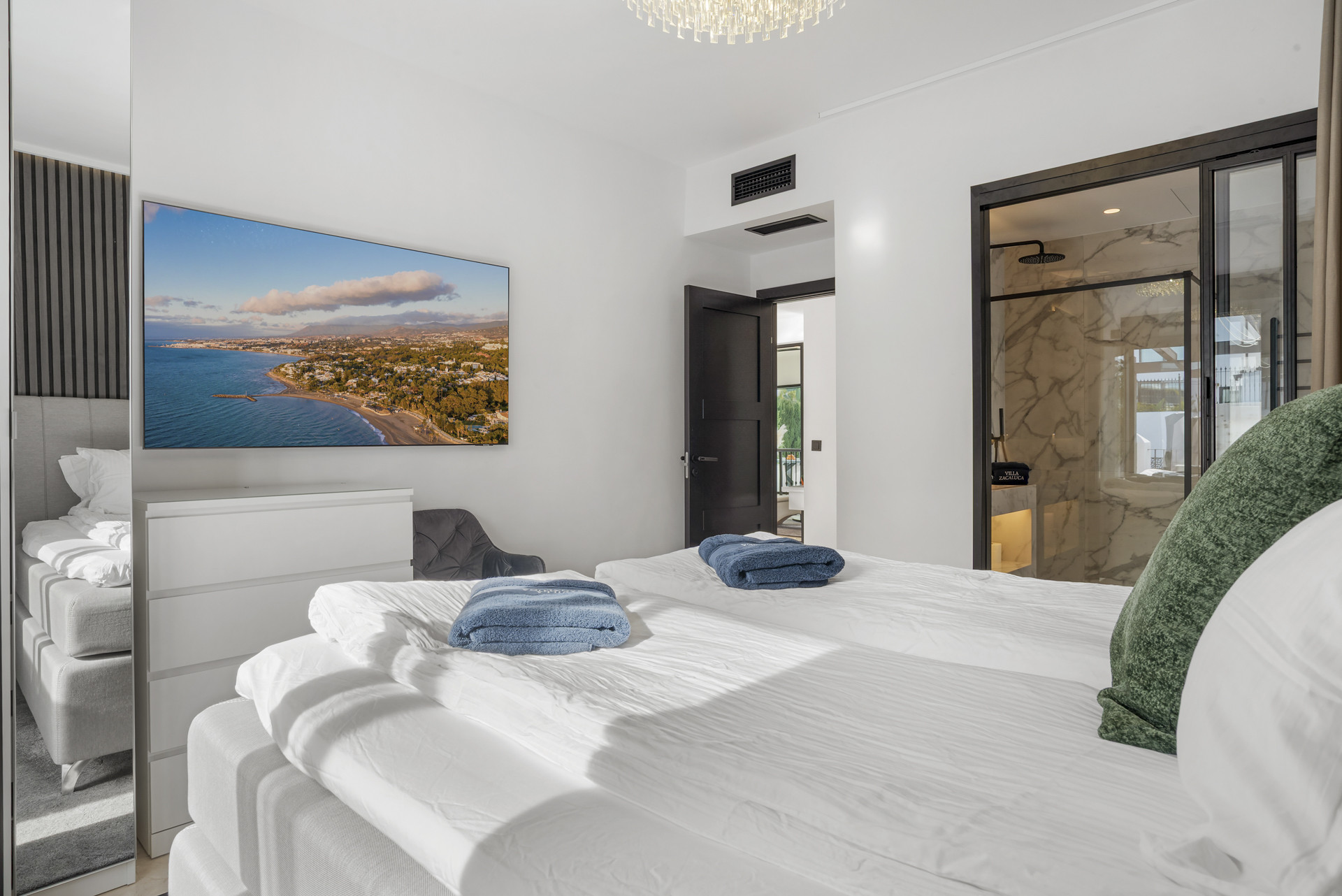 Im Inneren bietet die Villa wunderschön eingerichtete Schlafzimmer mit Luxus-Bettwäsche und modernen Ensuite-Badezimmern, die mit Marmor und hochwertigen Materialien ausgestattet sind. Jeder Raum wurde sorgfältig gestaltet, um Privatsphäre, Komfort und erholsamen Schlaf zu gewährleisten. Klimaanlagen im gesamten Anwesen sorgen das ganze Jahr über für ein angenehmes Raumklima.