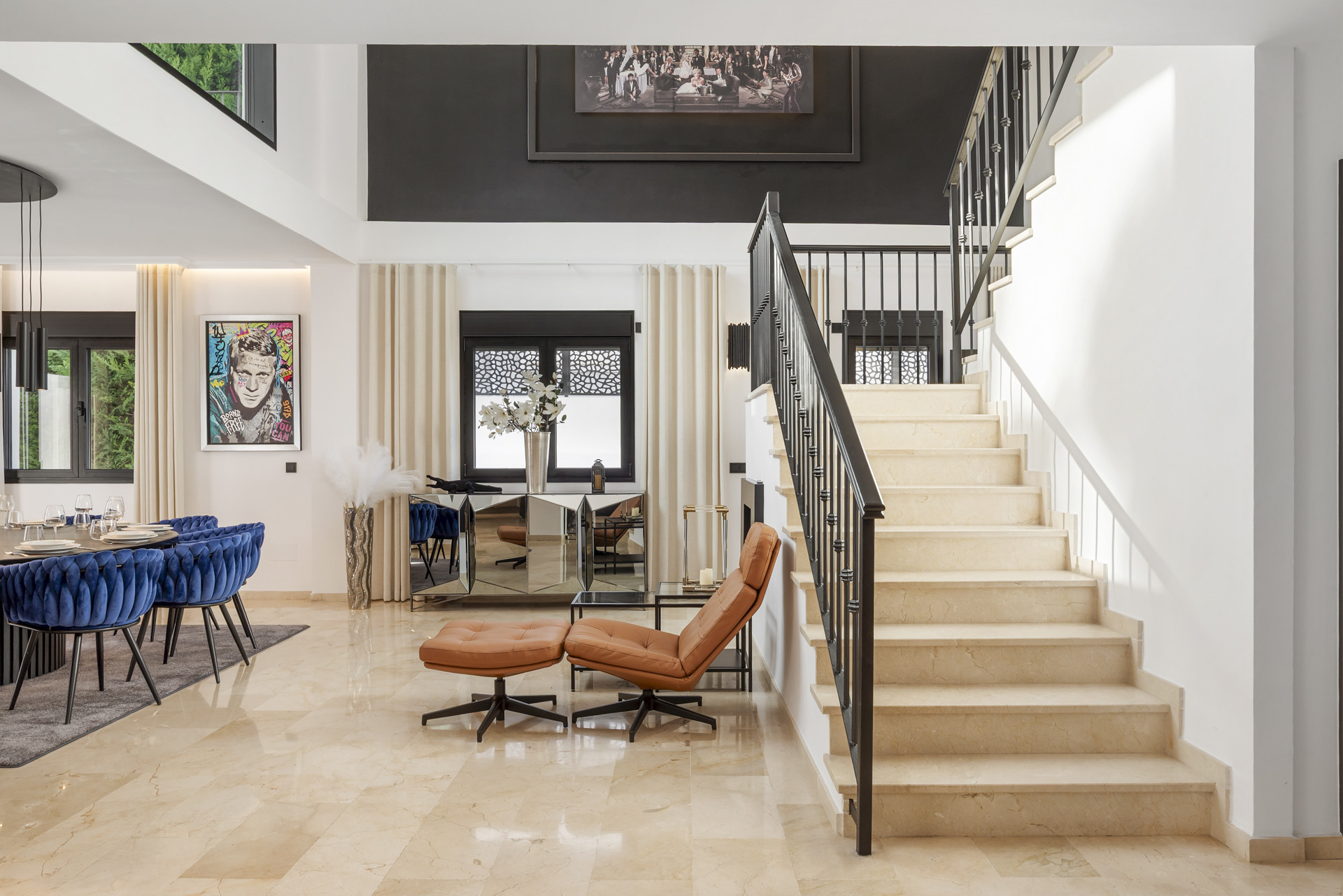 Die Villa verfügt über geräumige offene Wohnbereiche, die mit natürlichem Licht durchflutet sind, hohen Decken und Designer-Möbeln im gesamten Haus. Eine voll ausgestattete moderne Küche mit hochwertigen Geräten öffnet sich zu den Ess- und Loungebereichen und ist ideal zum Bewirten und Geselligtsein. Das Innendesign verbindet weiche neutrale Töne mit kühnen Akzenten und bietet eine raffinierte, aber einladende Atmosphäre.