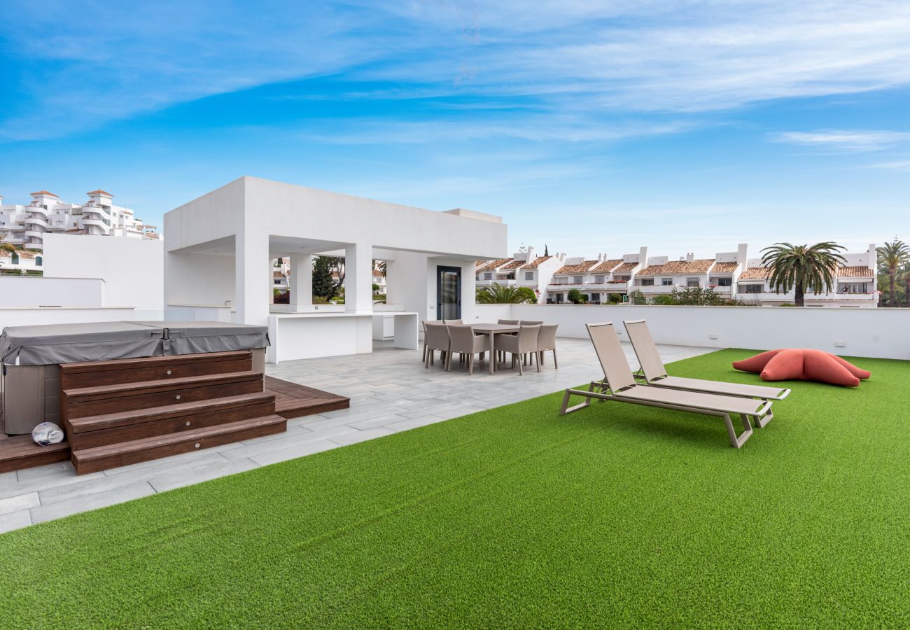 Eingebettet in die friedliche Wohnanlage von Elviria, Marbella, ist die Villa Donatella eine stilvolle 5-Schlafzimmer-, 3-Badezimmer-Villa, die andalusische Architektur mit zeitgemäßem Komfort verbindet. Nur wenige Augenblicke vom renommierten Santa Maria Golfclub entfernt und eine kurze Fahrt von Marbellas besten Stränden, bietet diese Immobilie eine erholsame Basis mit einfachem Zugang zu den besten Annehmlichkeiten der Gegend. Mit ihrer weiß getünchten Außenfassade, gefliesten Dachlinien und Bogenelementen besitzt die Villa einen warmen, lokalen Charme, während im Inneren moderne, schlichte Innenräume und eine lichtdurchflutete Raumaufteilung eine frische und einladende Atmosphäre schaffen.