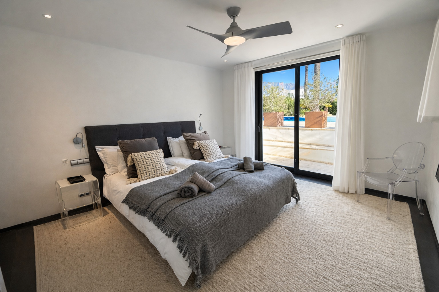 Das Hauptschlafzimmer ist geräumig mit einem großartigen Badezimmer en suite und einem begehbaren Kleiderschrank mit Blick auf den Poolbereich. Insgesamt gibt es 5 Schlafzimmer. Ein weiteres Schlafzimmer mit Badezimmer en suite befindet sich im Kellerbereich mit direktem Zugang zum Poolbereich.