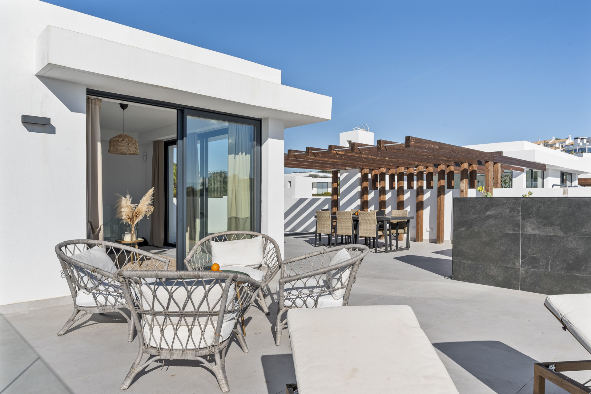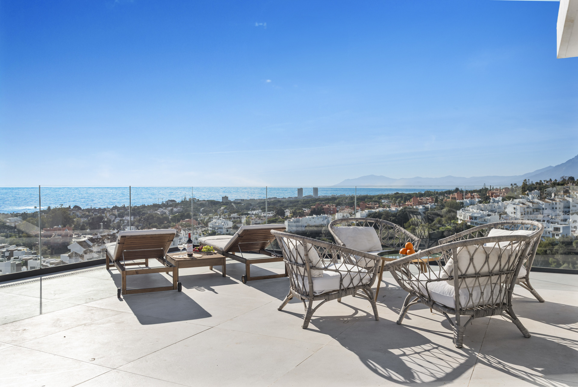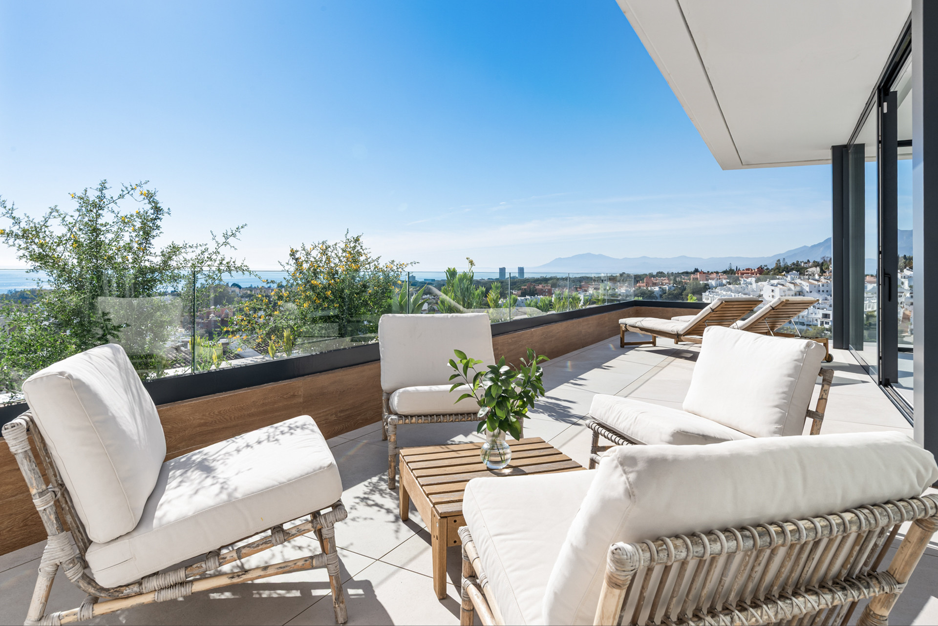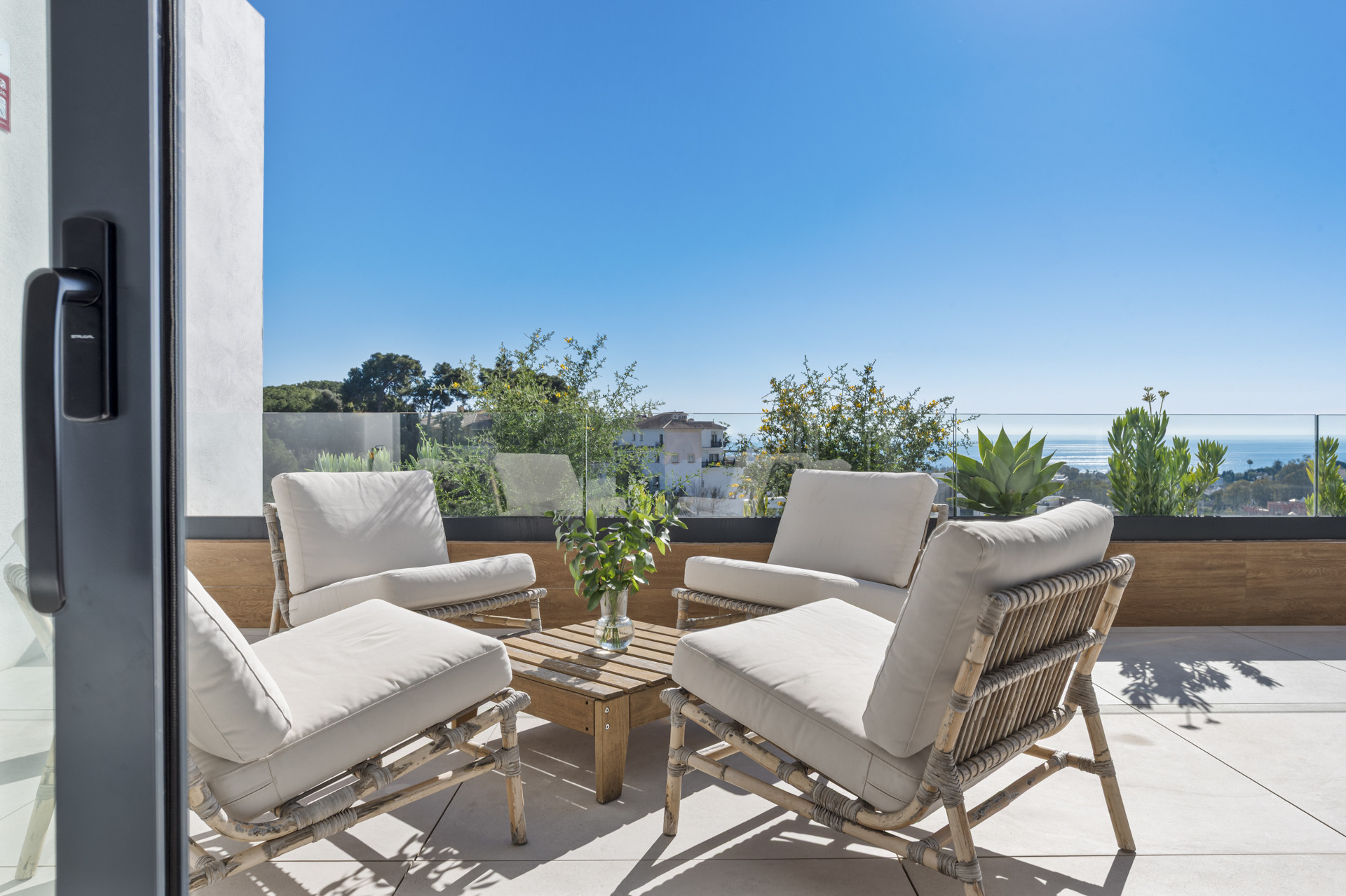 Lo que realmente distingue este ático es su extraordinario espacio de vida al aire libre. Además de los tres dormitorios principales, hay una habitación extra en la planta superior que conduce a la terraza en la azotea, con un sofá-cama que puede alojar a 2 huéspedes adicionales. La azotea es realmente impresionante, con vistas panorámicas al mar increíbles, amplias áreas de descanso, tumbonas, un espacio para comer al aire libre, zona de barbacoa y una piscina privada de inmersión ubicada para disfrutar de los mejores paisajes. Diseñada tanto para la relajación como para el entretenimiento, esta terraza superior crea un entorno inolvidable desde el amanecer hasta el atardecer, mientras que la terraza inferior continúa el flujo interior-exterior con más espacio para relajarse y disfrutar de las vistas.