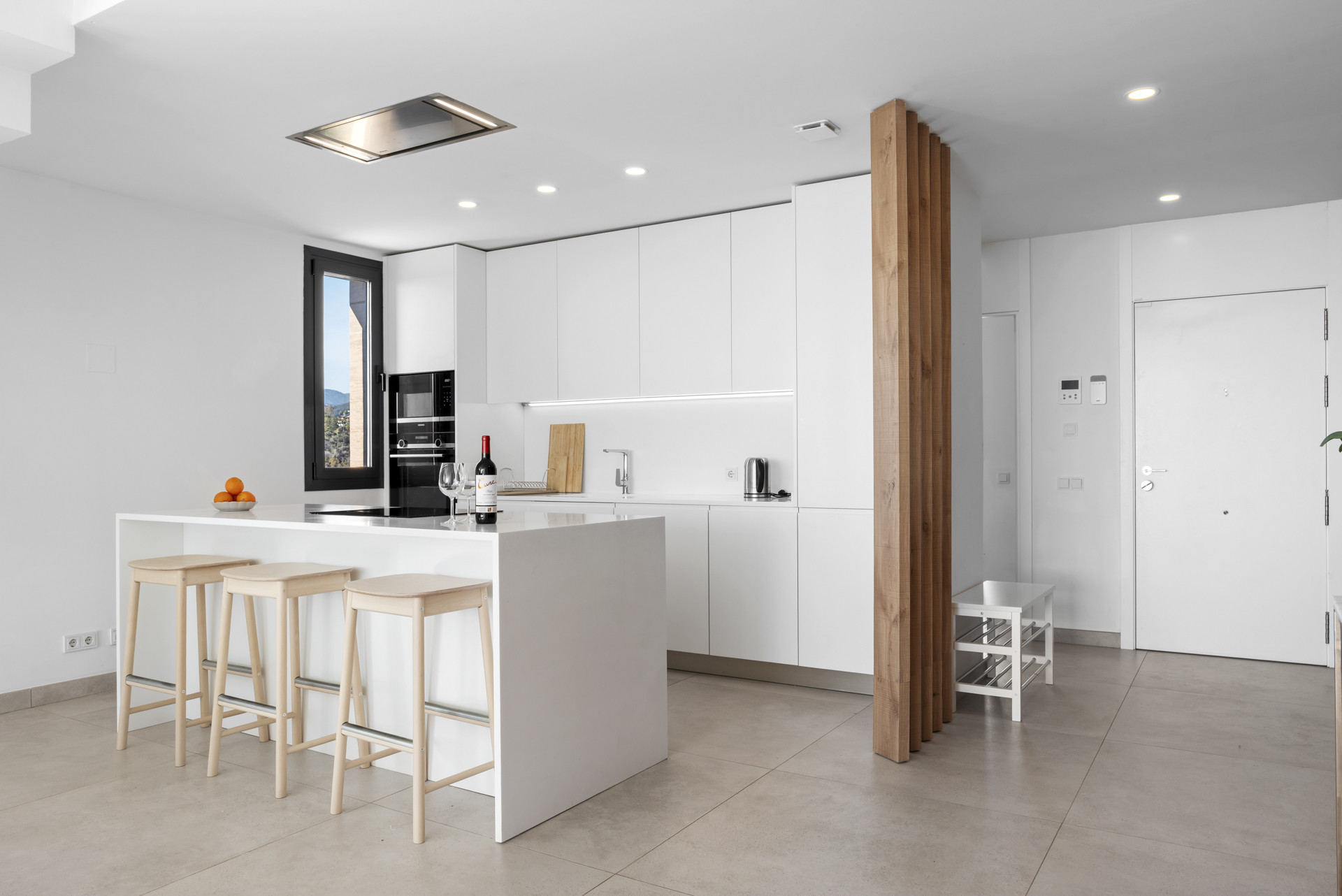 En el interior, el apartamento cuenta con sofisticados pisos de mármol, suaves tonos neutros y amplias ventanas del piso al techo que bañan el espacio con luz natural, lo que lo hace sentir abierto y aireado. La sala de estar de planta abierta desemboca perfectamente en una terraza privada, que ofrece el lugar perfecto para tomar un tranquilo café por la mañana o una copa de vino por la noche mientras contempla el resplandeciente mar a la izquierda.