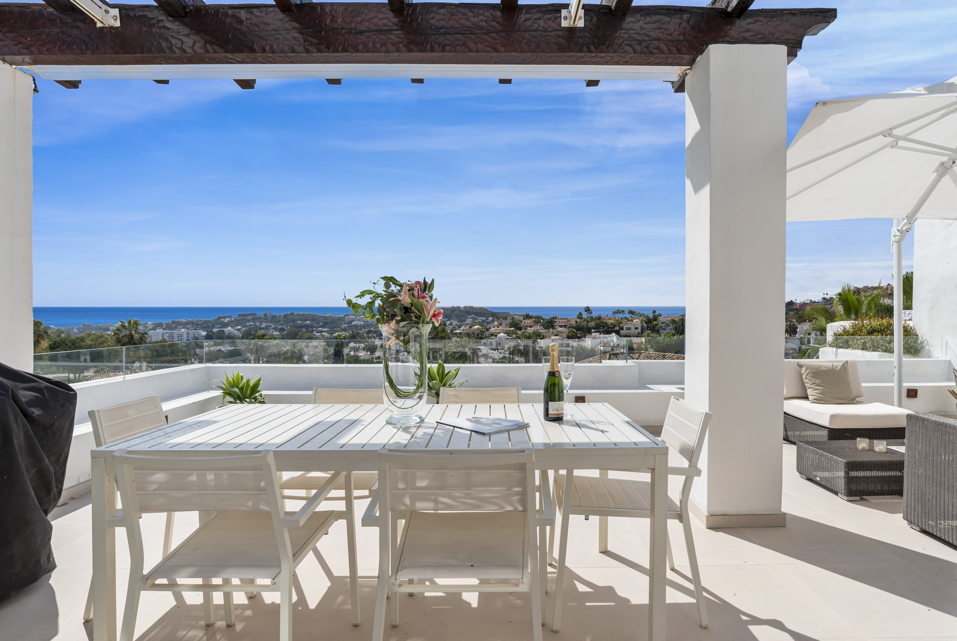 Este impresionante ático con orientación oeste está ubicado dentro de la prestigiosa urbanización Las Tortugas de Aloha en Nueva Andalucía, Marbella. Distribuido en dos niveles bellamente diseñados, ofrece una combinación perfecta de confort moderno y estilo elegante, enmarcado por impresionantes vistas al mar y a la montaña. Su entorno privado y tranquilo, combinado con amplias terrazas e interiores de planta abierta, lo convierte en un retiro ideal para aquellos que buscan paz, lujo y un estilo de vida soleado en una de las zonas más codiciadas de Marbella.