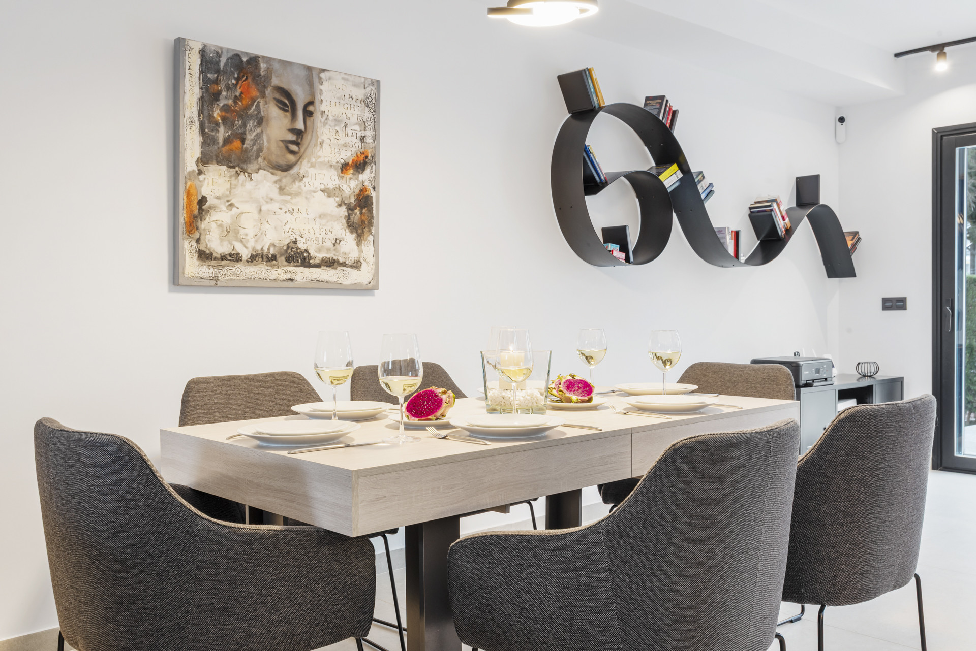 En la planta de entrada, encontrará una zona de estar y cocina diáfana y luminosa con una elegante barra de desayuno. La cocina está completamente equipada con electrodomésticos de alta calidad, mientras que el espacio de estar ofrece asientos cómodos para seis personas y una gran Smart TV. Las puertas corredizas dan acceso a una generosa terraza con una zona de comedor al aire libre y asientos de salón acogedores, que proporcionan acceso directo a los hermosos jardines comunitarios y una gran piscina.