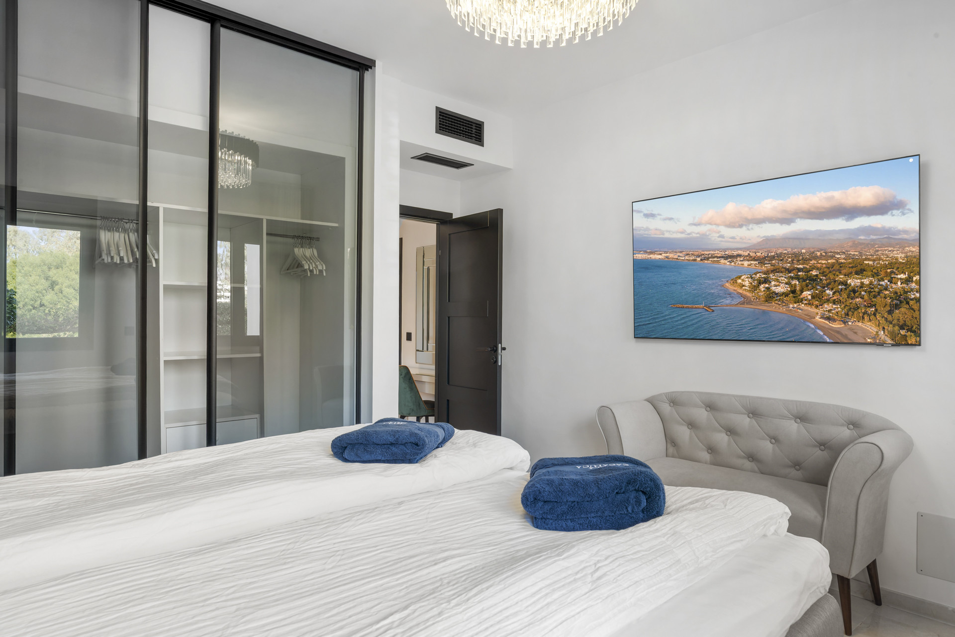 En el interior, la villa ofrece dormitorios bellamente amueblados con ropa de cama de lujo y baños modernos en suite acabados en mármol y materiales de alta calidad. Cada espacio ha sido diseñado cuidadosamente para garantizar privacidad, comodidad y un sueño reparador. El aire acondicionado en toda la propiedad asegura una temperatura agradable durante todo el año.