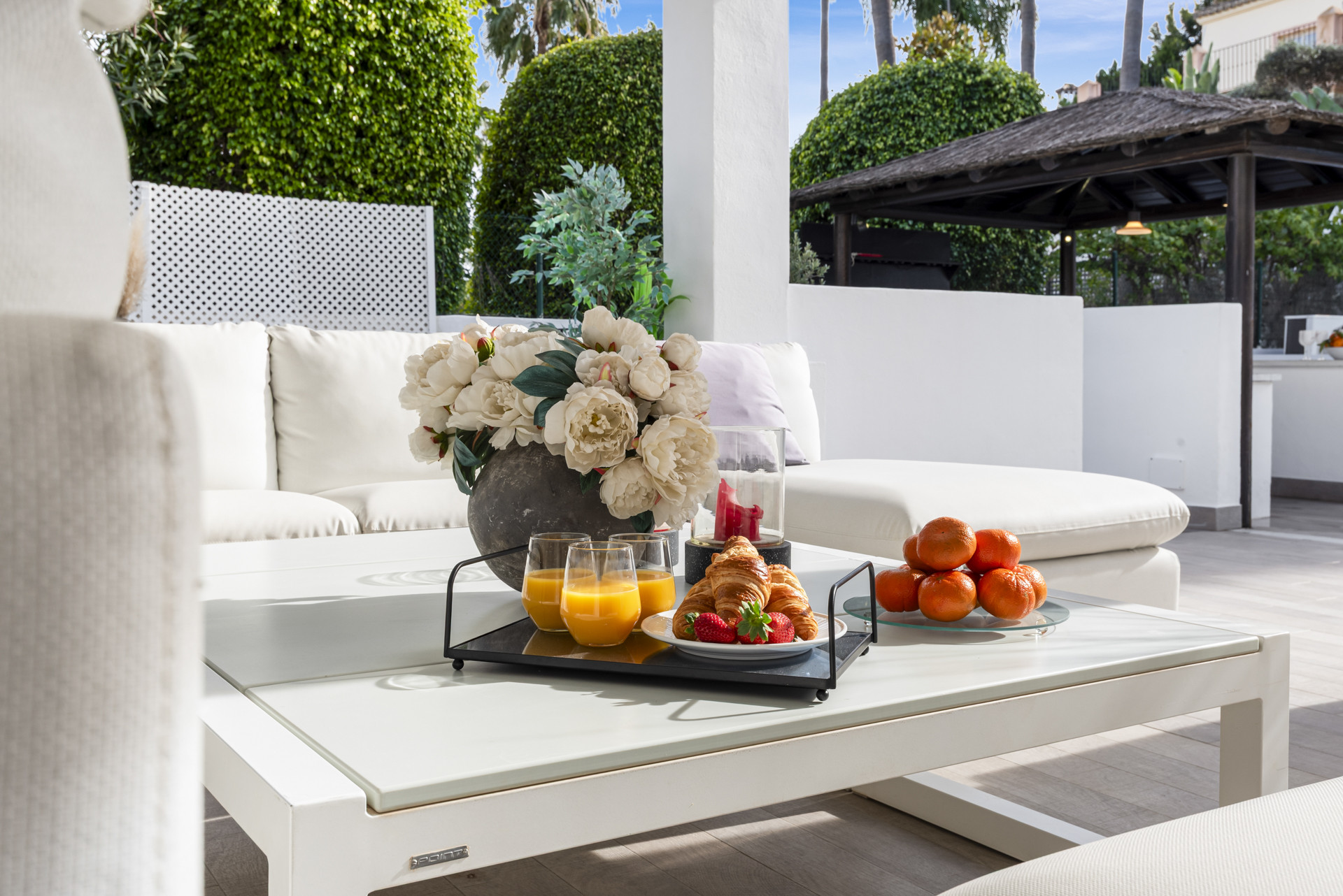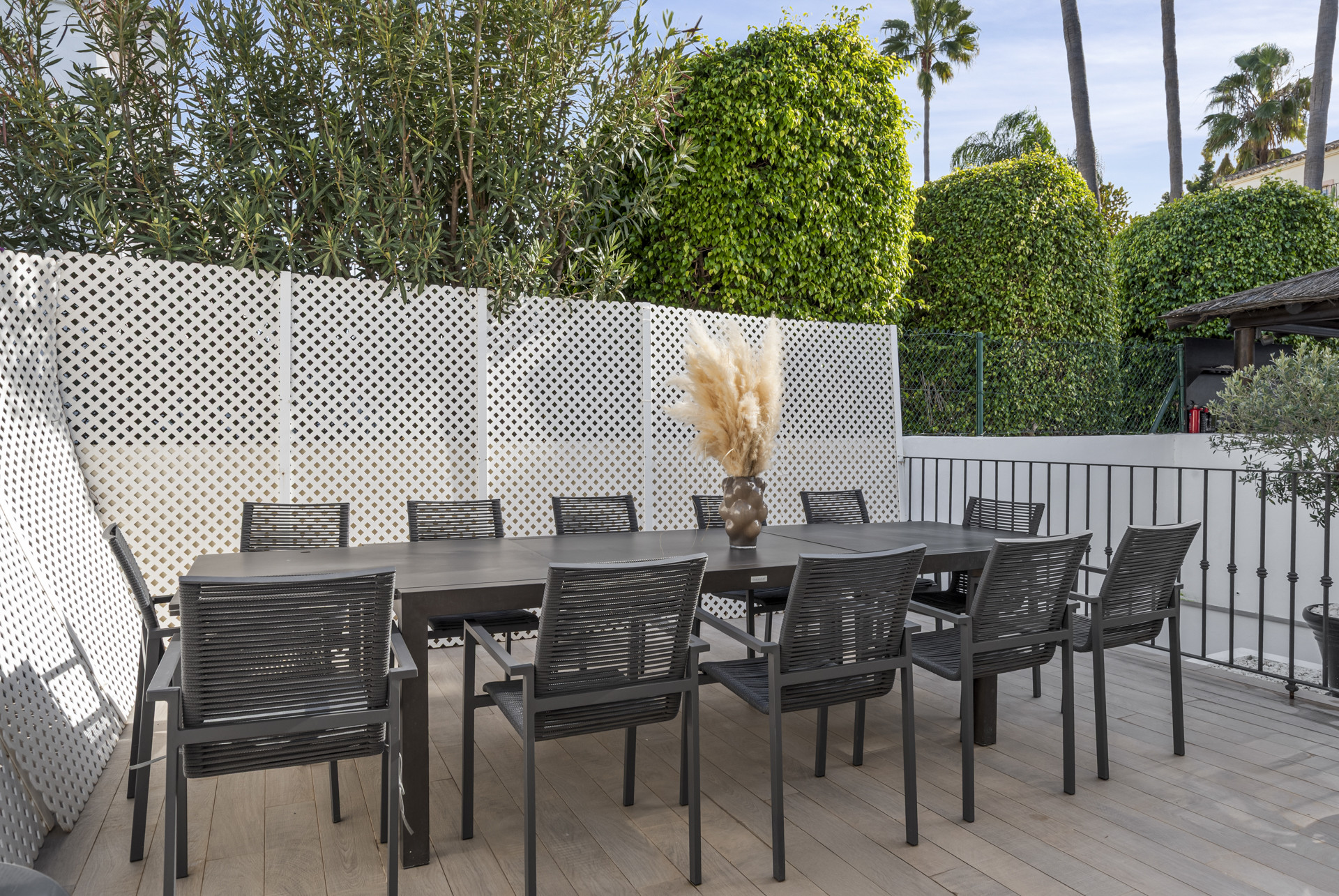 El jardín paisajístico es completamente privado y está bellamente mantenido, con palmeras, árboles cítricos e iluminación elegante que crean un ambiente sereno de vacaciones. Ya sea relajándose en la terraza de descanso sombreada, disfrutando de una copa de vino junto a la piscina, o organizando una cena al atardecer, cada rincón de la propiedad está diseñado para la comodidad y el placer.