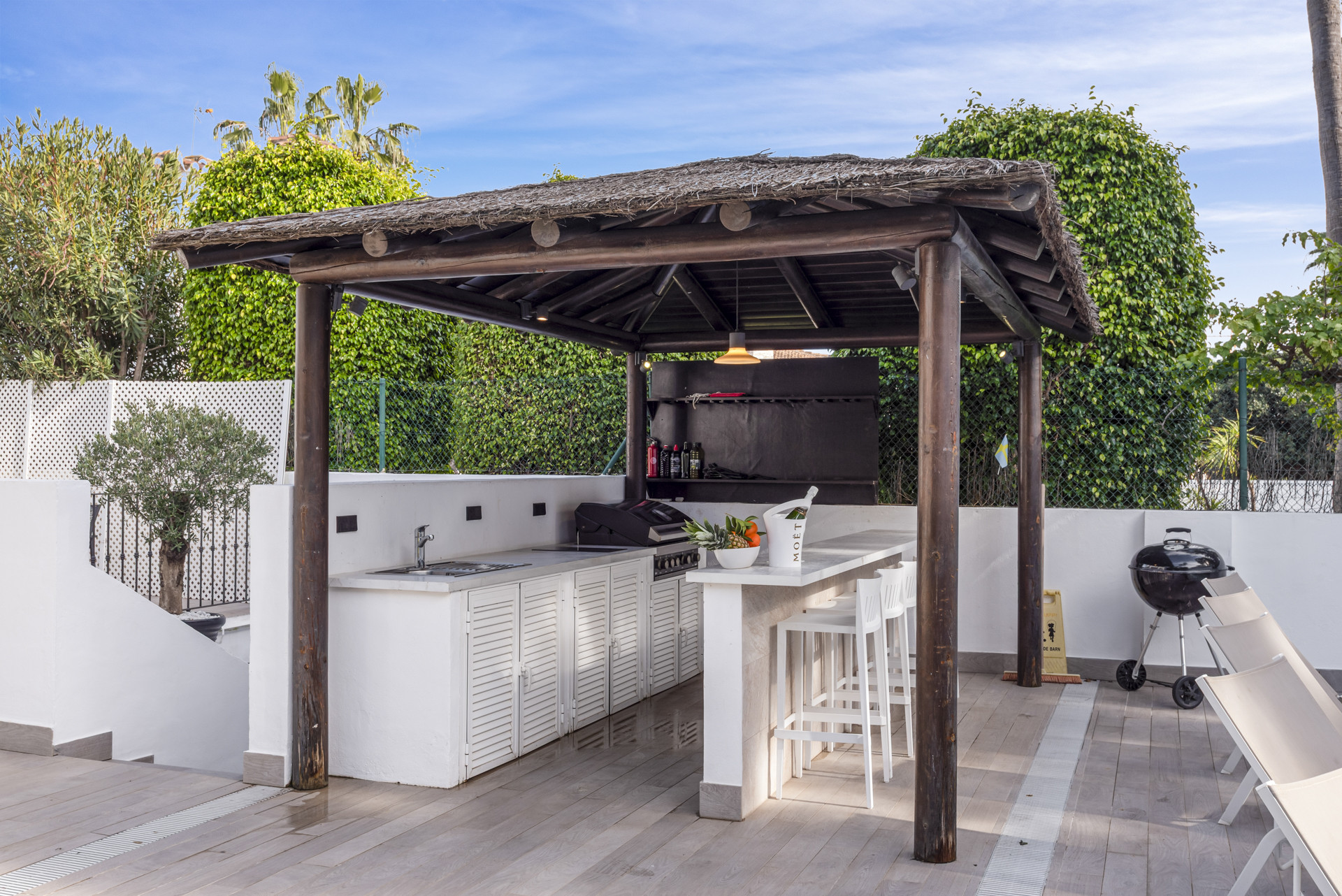 Fuera, la villa realmente brilla. La piscina privada está rodeada de tumbonas y vegetación exuberante, ofreciendo un remanso de tranquilidad para tomar el sol y refrescarse durante los días cálidos. Para mayor comodidad durante todo el año, la piscina se puede calentar bajo petición con un costo adicional. Una cocina exterior cubierta y un área de bar con barbacoa proporcionan el espacio perfecto para almuerzos al aire libre prolongados y cócteles nocturnos. Múltiples terrazas y áreas de asiento le permiten disfrutar tanto del sol como de la sombra en cualquier momento del día.