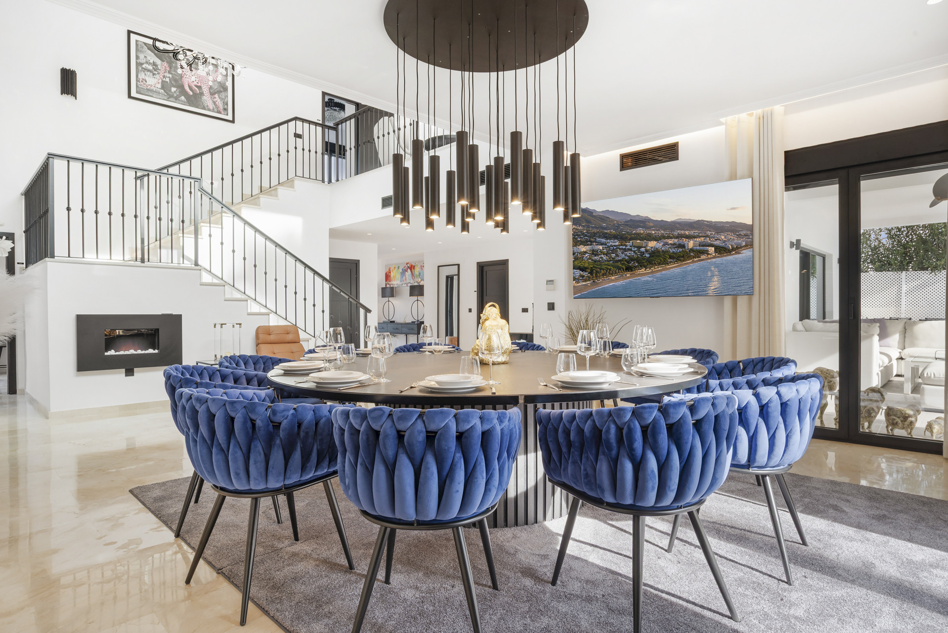 La villa cuenta con amplias áreas de estar de planta abierta llenas de luz natural, techos altos y mobiliario de diseñador en todo el espacio. Una cocina moderna totalmente equipada con electrodomésticos de primera calidad se abre a las áreas de comedor y salón, ideal para entretener y socializar. El diseño interior combina tonos neutros suaves con acentos audaces, ofreciendo un ambiente refinado pero acogedor.