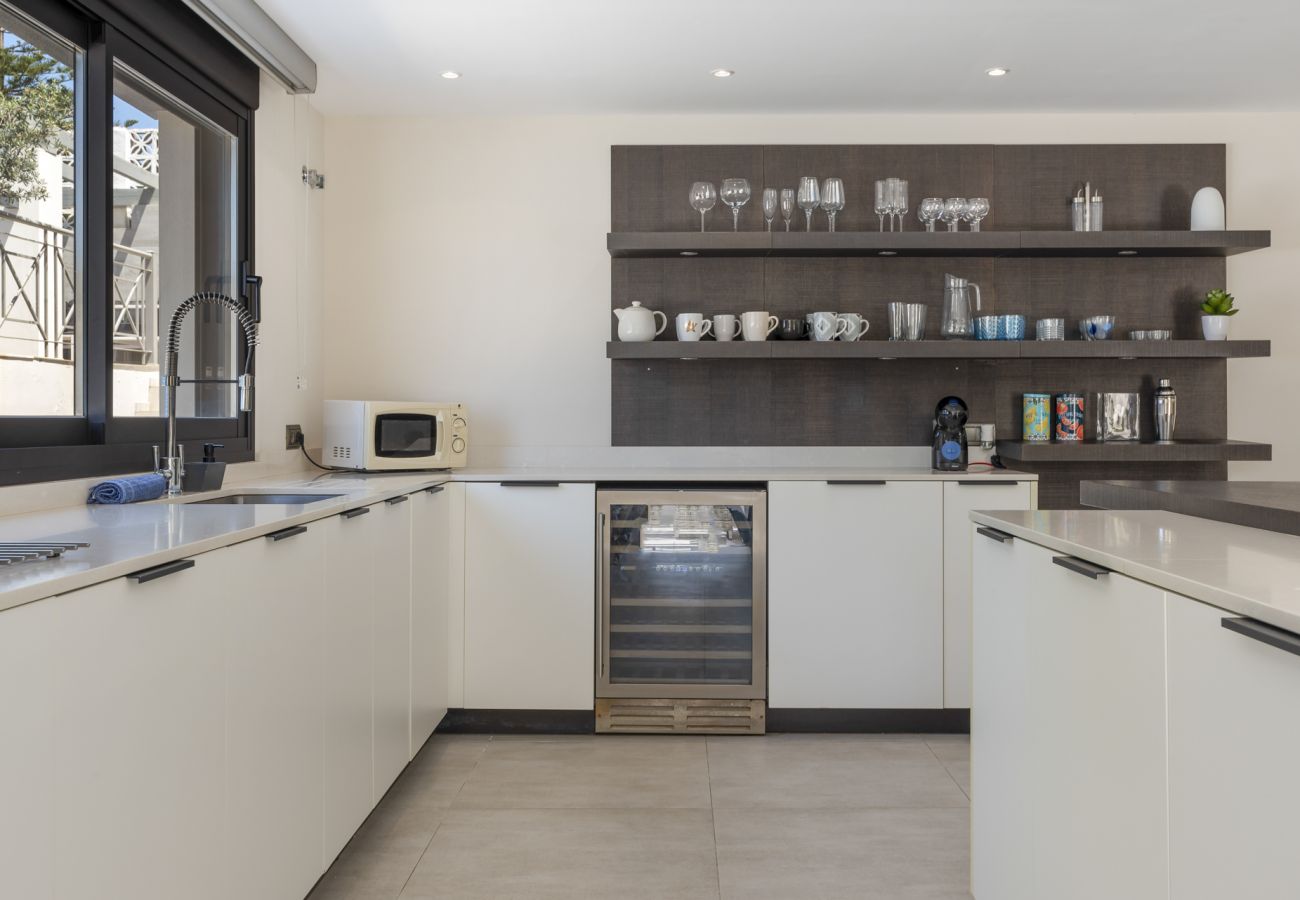 Desde el área de la cocina, hay acceso directo a la terraza exterior y la zona de la piscina.