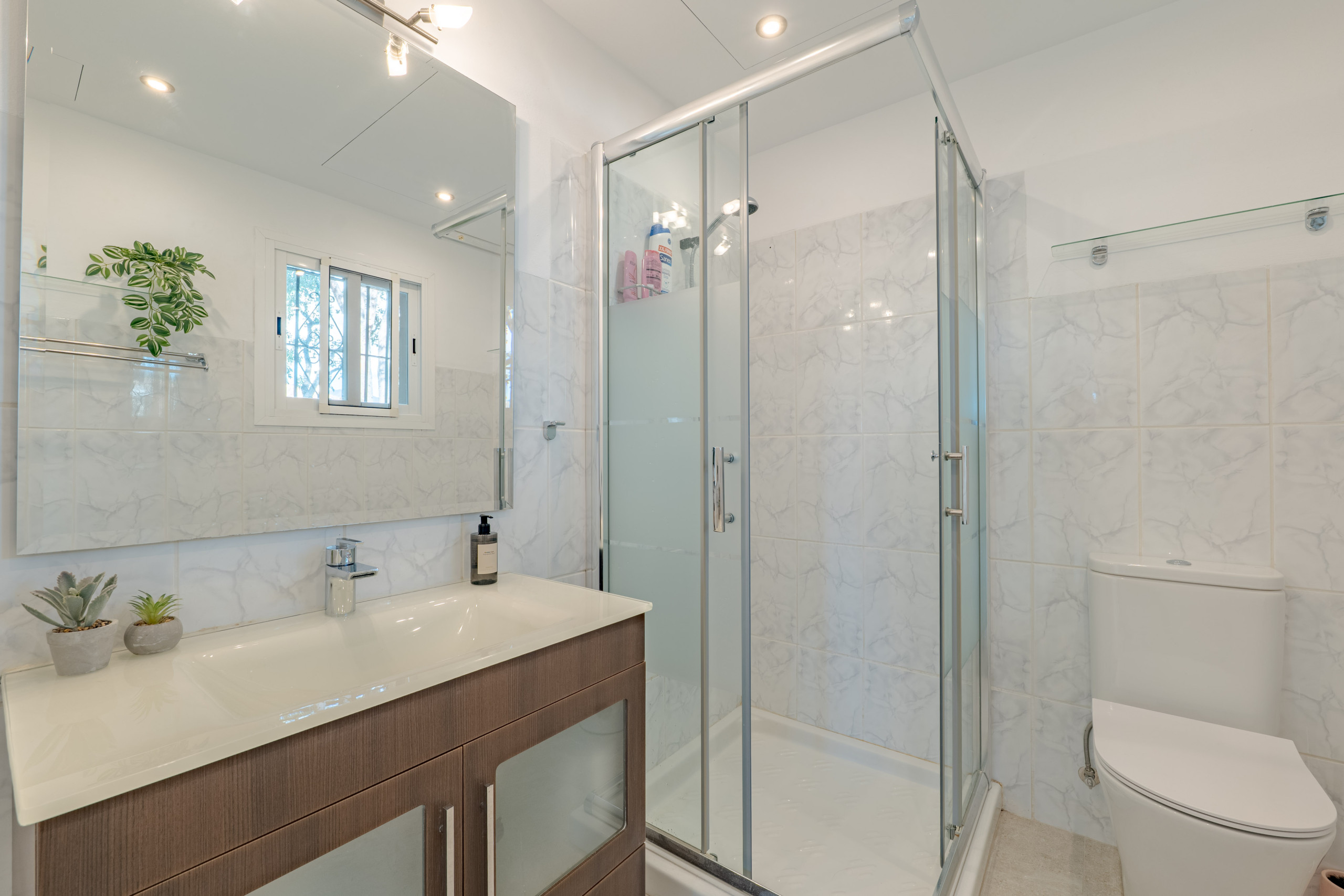 La villa cuenta con cuatro dormitorios espaciosos, todos con armarios empotrados. Tres dormitorios tienen baños en suite, mientras que el cuarto dormitorio disfruta de un baño privado separado, proporcionando un excelente confort y privacidad para familias o grupos de amigos. Un aseo de invitados adicional añade aún más comodidad.