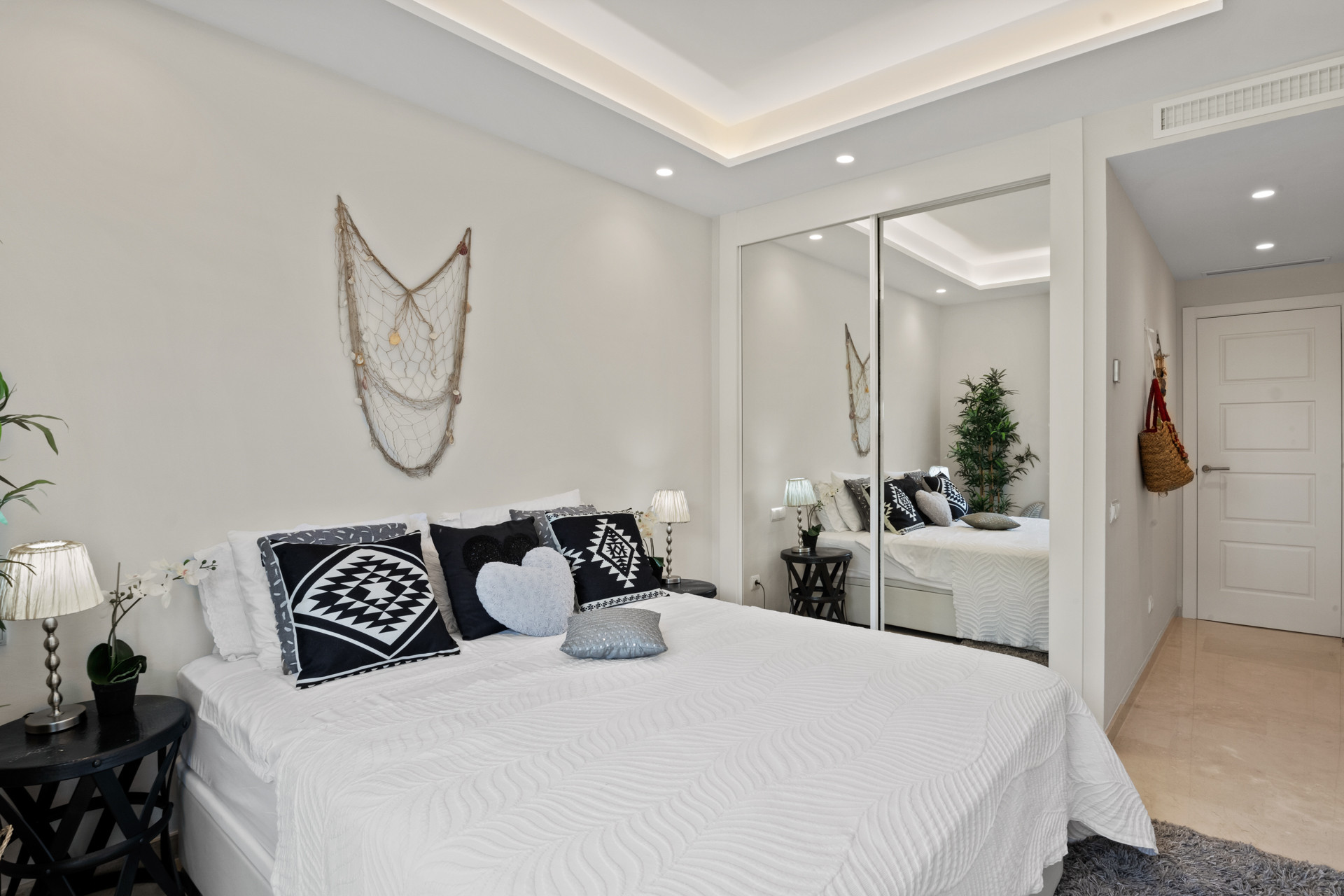 Appartement à Marbella qui possède 3 chambre(s) et Capacité pour 6 personnes. Logement de 121 m² meublé avec goût et moderne, situé en front de plage, avec vue sur la mer et le jardin. La location se trouve à 0 m de la plage de sable, 0 m du restaurant, 0 m de la cafétéria, 350 m de la gare routière, 3 km du domaine de Golf, 3 km du supermarché, 6 km de la ville, 9 km de l'hôpital, 16 km du parc aquatique, 40 km de l'aéroport, 40 km de l'aéroport et il est situé dans une zone idéale pour familles zone et dans la zone urbaine.Elle dispose de ascenseur, 46 m² de terrasse, lave-linge, fer à repasser, accès internet (wifi), sèche-cheveux, balcon, piste de paddle, salle de sport, chauffage central, climatisation, piscine collective, parking extérieur même bâtiment, 2 Télévisions, tv satellite.La cuisine indépendante, à induction, est équipée avec réfrigérateur, micro-ondes, four, congélateur, lave-vaisselle, vaisselle/couverts, ustensiles/cuisine, cafetière, grille pain et equipement de cuisine.1 avis