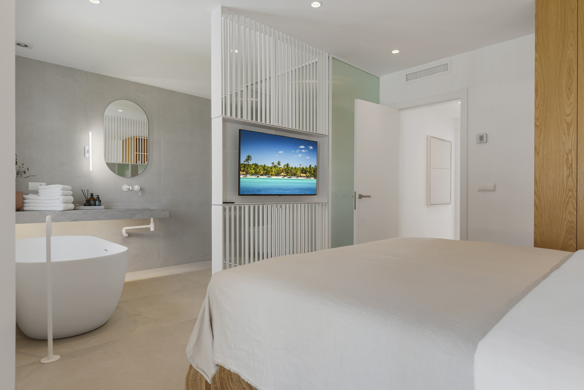 The third level houses the cozy third bedroom, with a half bathroom conveniently located across from it. This level also features an upper terrace, offering tailored views of the Mediterranean Sea and a cozy spot for late-night lounging under the stars.