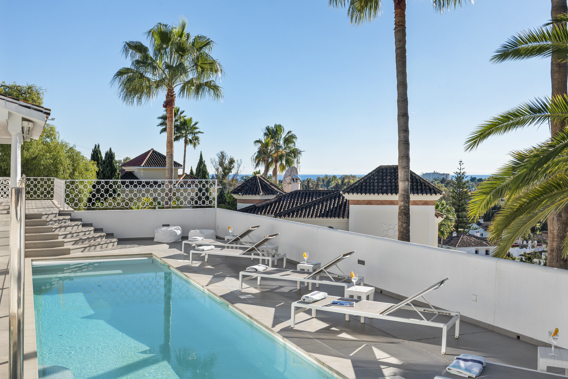 Villa à Marbella qui possède 5 chambre(s) et Capacité pour 10 personnes. Logement de 491 m² joli et moderne, avec vue sur la mer et la montagne. La location se trouve à 1 m de la cafétéria, 700 m du supermarché, 800 m du domaine de Golf, 1 km du restaurant, 2 km de la plage de sable, 2 km de la ville, 5 km de l'hôpital, 65 km de l'aéroport et au centre de la ville.Elle dispose de mobilier de jardin, clôture, 87 m² de terrasse, lave-linge, sèche-linge, barbecue, cheminée, fer à repasser, accès internet (wifi), sèche-cheveux, alarme, chauffage central, climatisation, piscine privée, parking extérieur même bâtiment, 1 Télévision.La cuisine indépendante, à induction, est équipée avec réfrigérateur, micro-ondes, four, congélateur, lave-vaisselle, vaisselle/couverts, ustensiles/cuisine, cafetière, grille pain, bouilloire et equipement de cuisine.2 avis