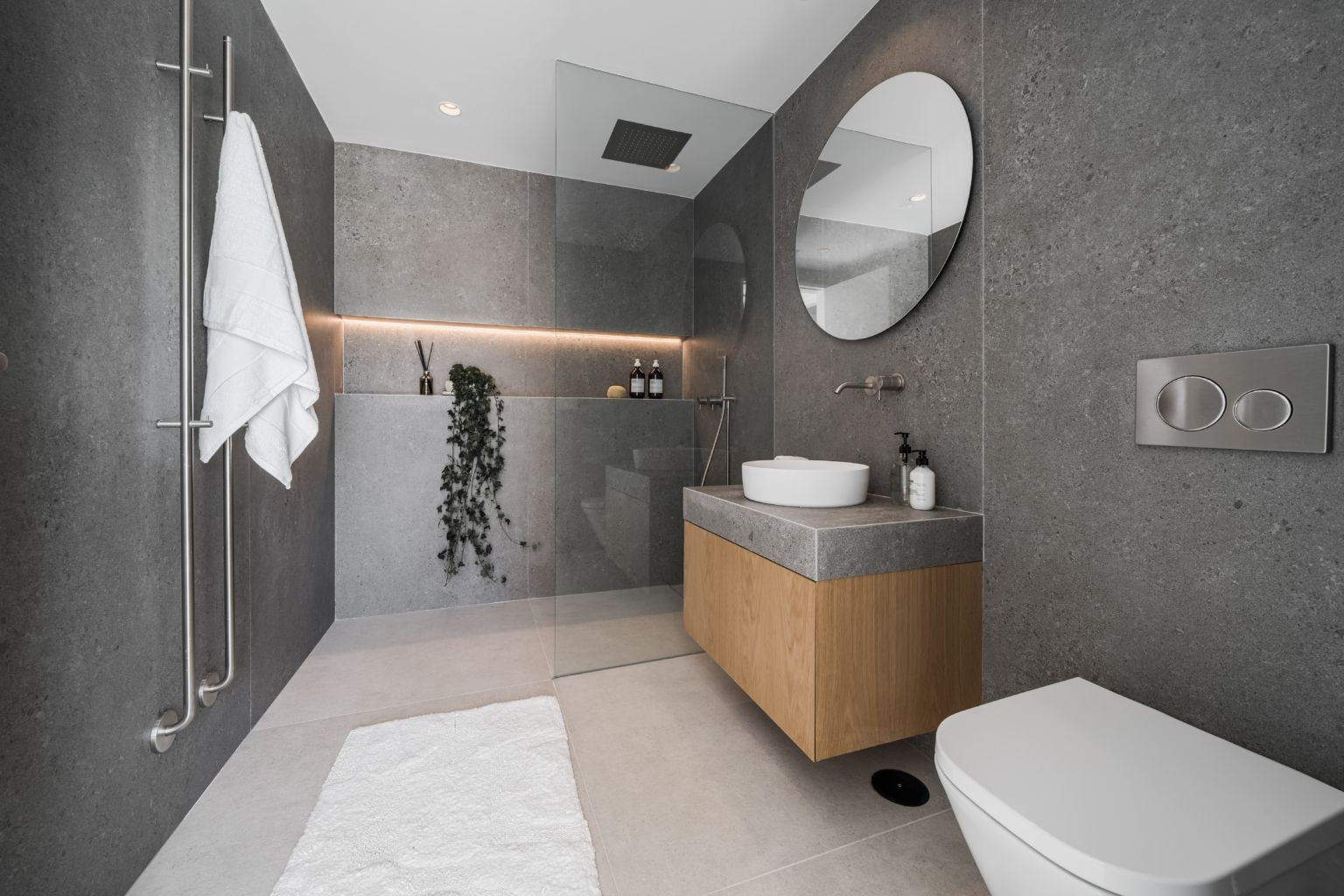 Upon entering, you are greeted by a large open-plan living and kitchen area, featuring expansive picture windows that open up to the terrace. These sliding windows can be folded on two sides, seamlessly blending the indoor living space with the outdoor terrace. Step outside to enjoy the beautiful infinity pool and lush garden area, creating an ideal setting for those long summer days.