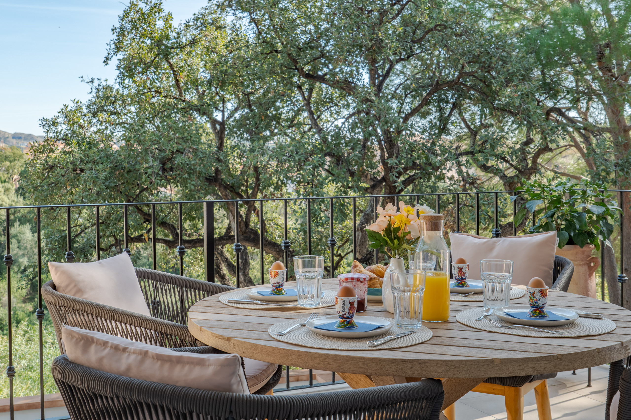The villa features four bedrooms—one located on the ground floor and three on the upper level. Both the downstairs bedroom and the master suite upstairs are en-suite and offer direct access to the terraces. The other two upstairs bedrooms share a bathroom. All bedrooms feature a King size bed for your comfort and relaxation, This layout comfortably accommodates up to 8 guests.