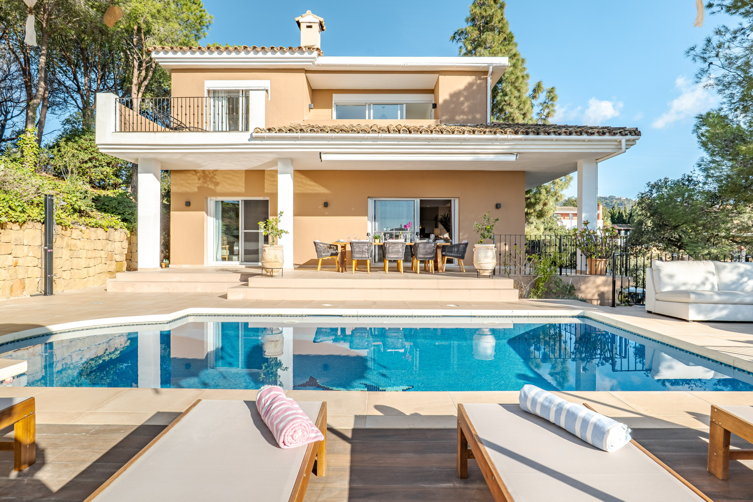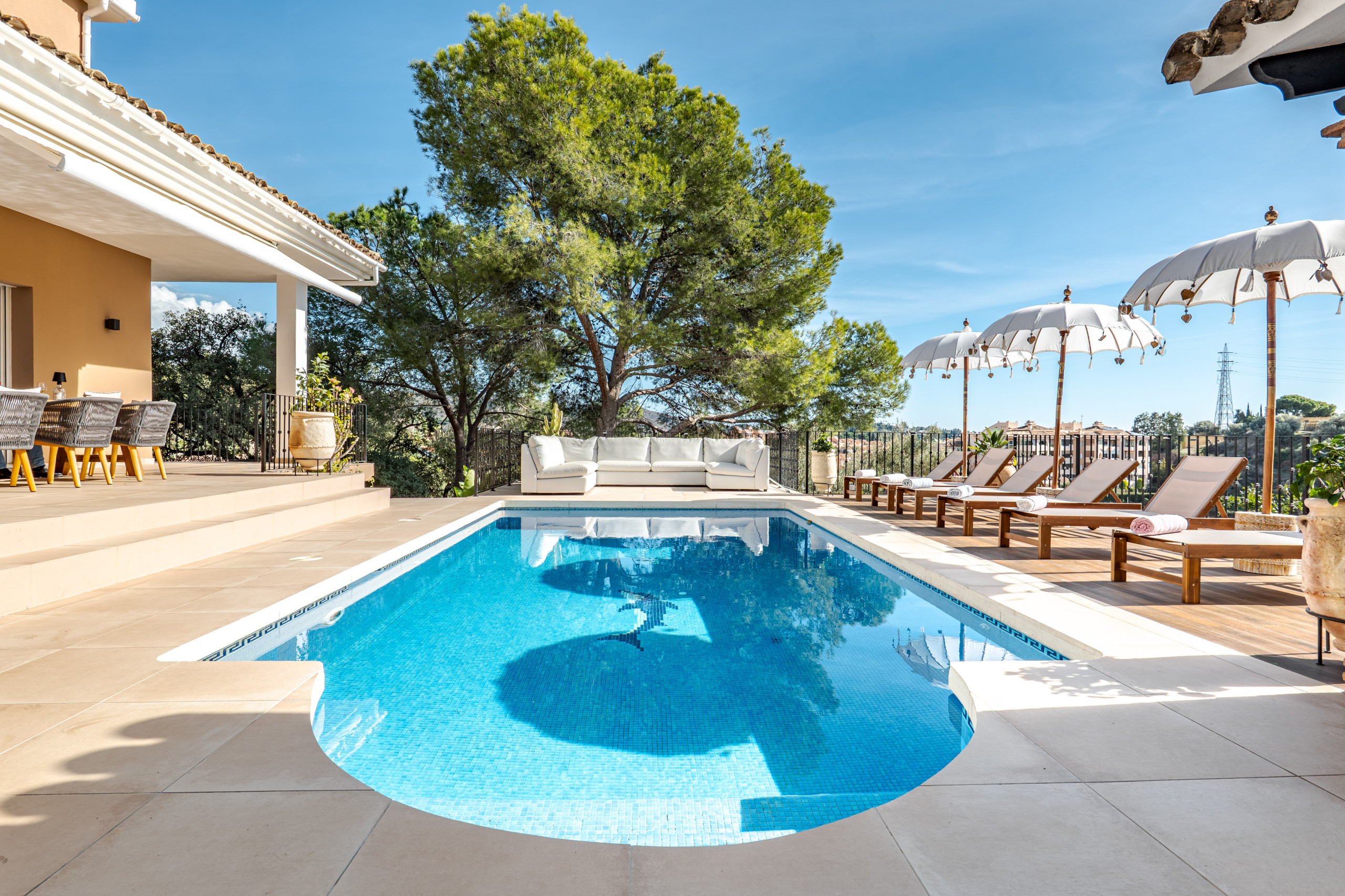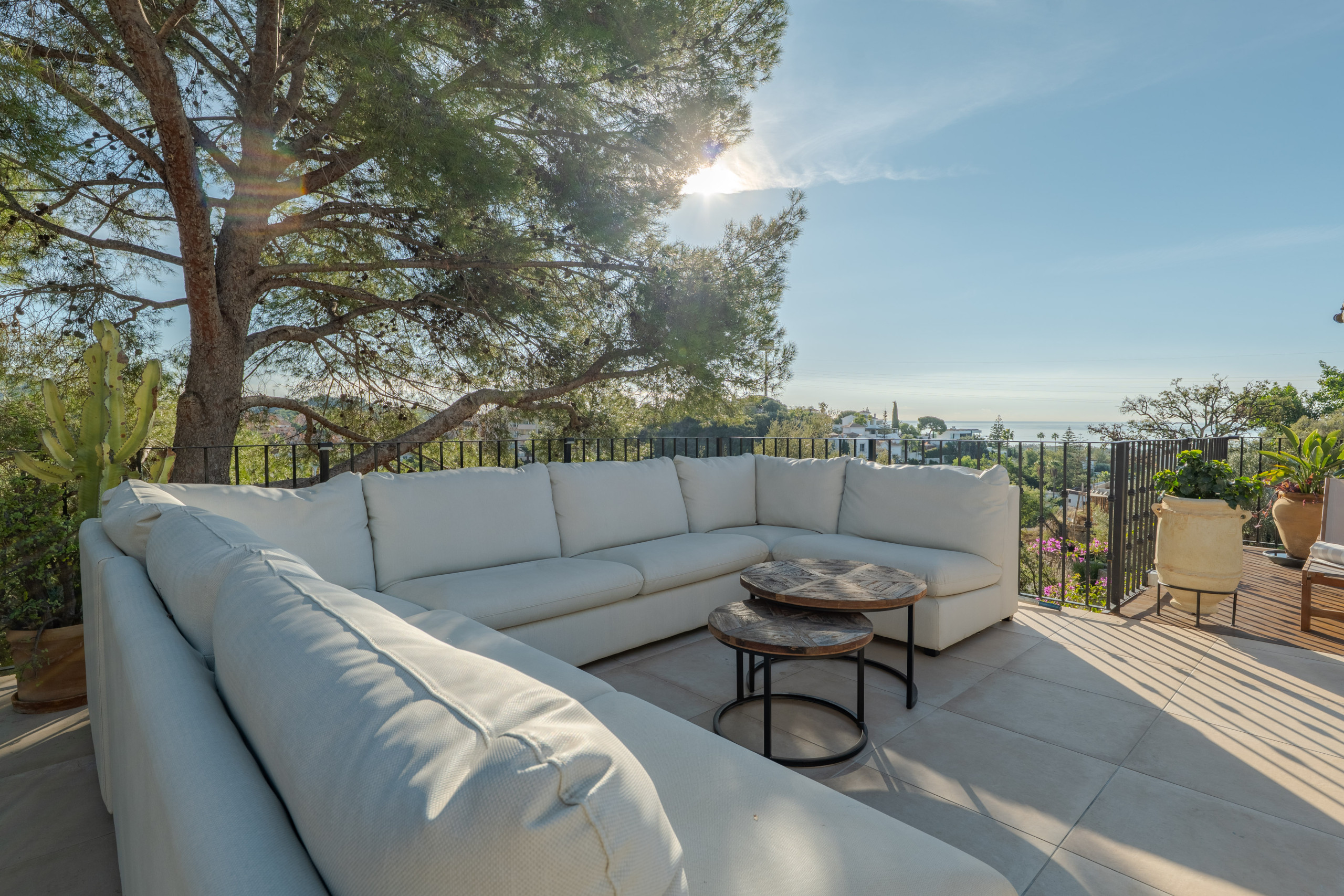 Conçue pour un mode de vie méditerranéen détendu, la propriété offre des vues panoramiques sur la mer qui peuvent être appréciées depuis les espaces de vie intérieurs et les généreux espaces extérieurs. La villa propose plusieurs espaces de détente extérieurs, parfaits pour se détendre tout au long de la journée, ainsi que des transats près de la piscine privée pour profiter du soleil de Marbella.