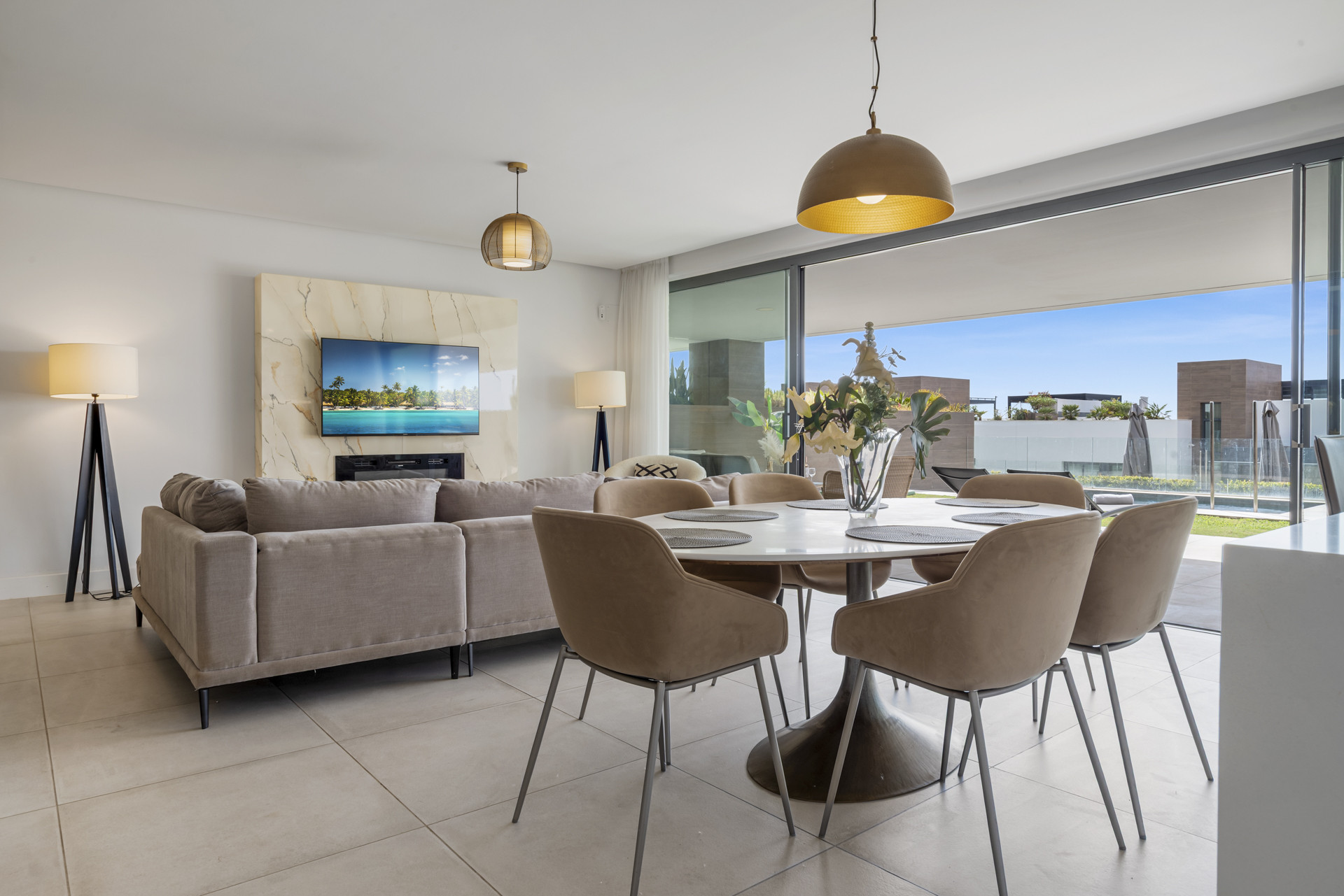 La maison propose quatre chambres confortables réparties sur ses trois niveaux, avec des salles de bains élégantes dotées de finitions haut de gamme et des agencements pratiques pour les groupes ou les familles. Les invités bénéficient également d'un accès complet à un ensemble d'équipements communautaires, dont une grande piscine partagée, une piscine intérieure chauffée, une salle de sport moderne et un sauna — apportant une ambiance de resort boutique directement à votre porte.