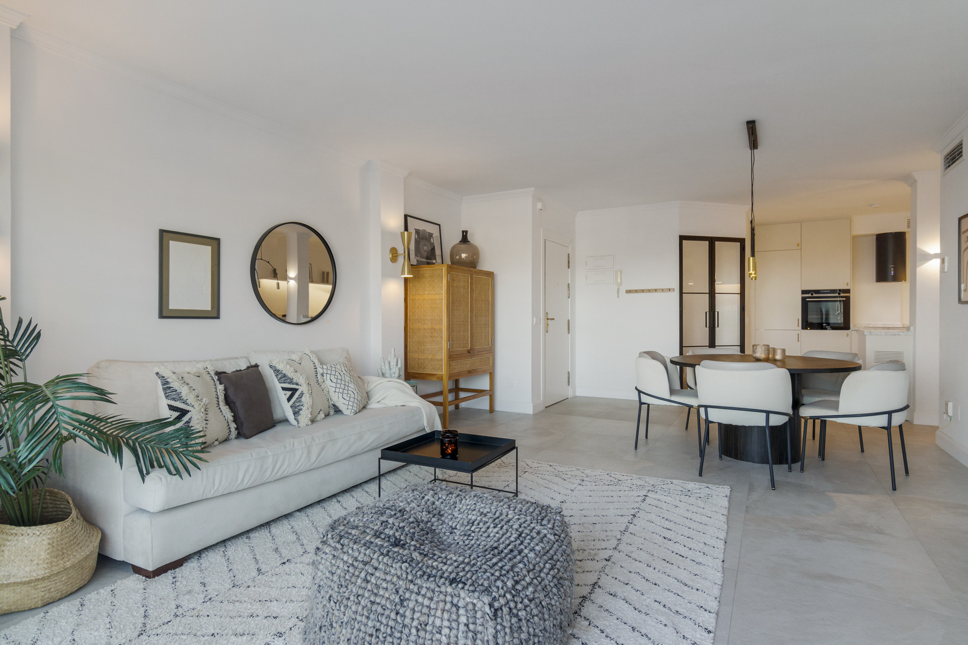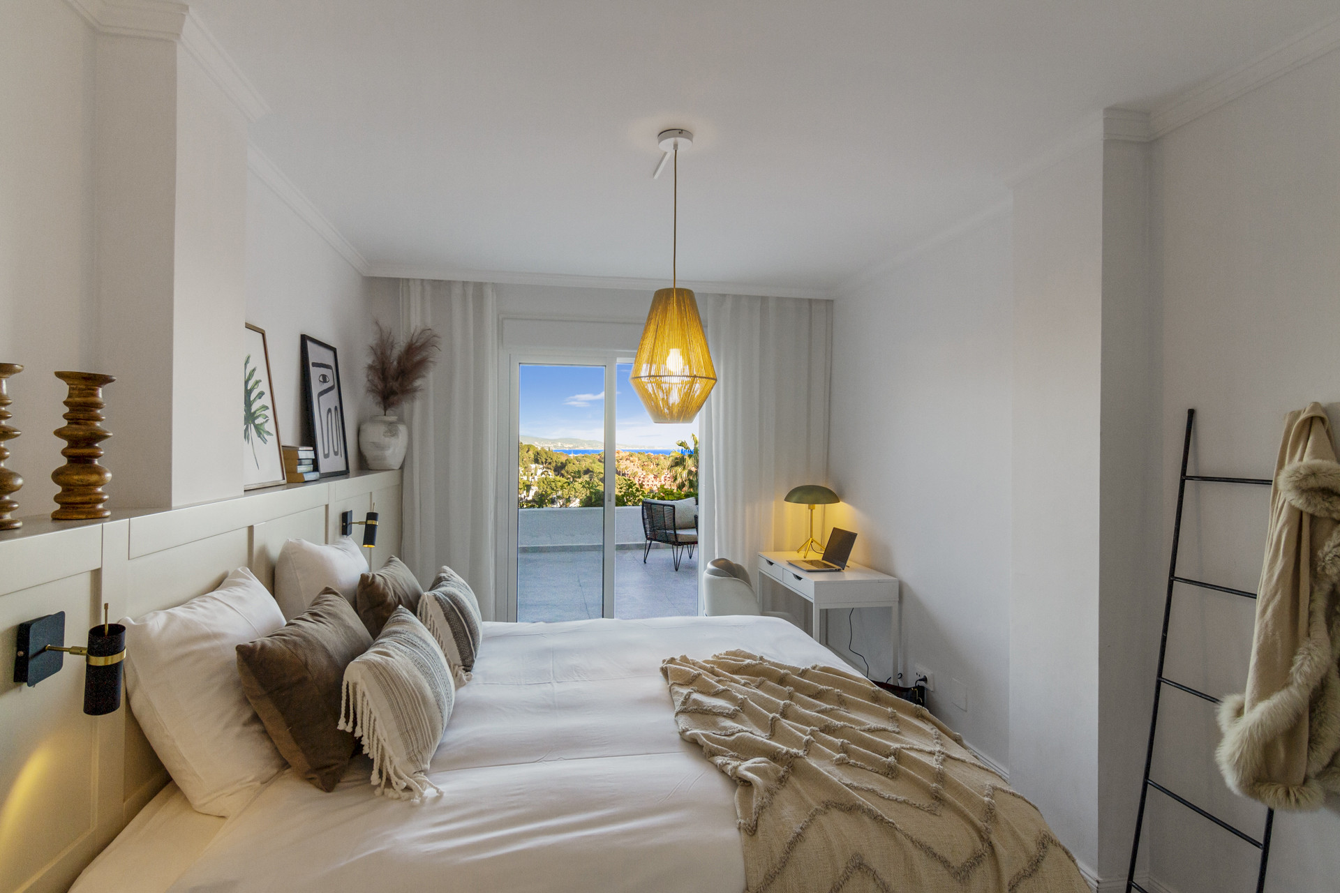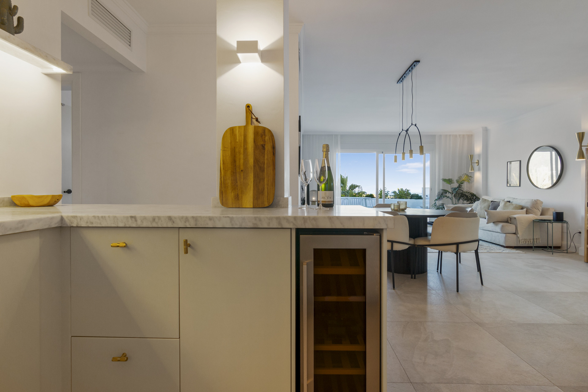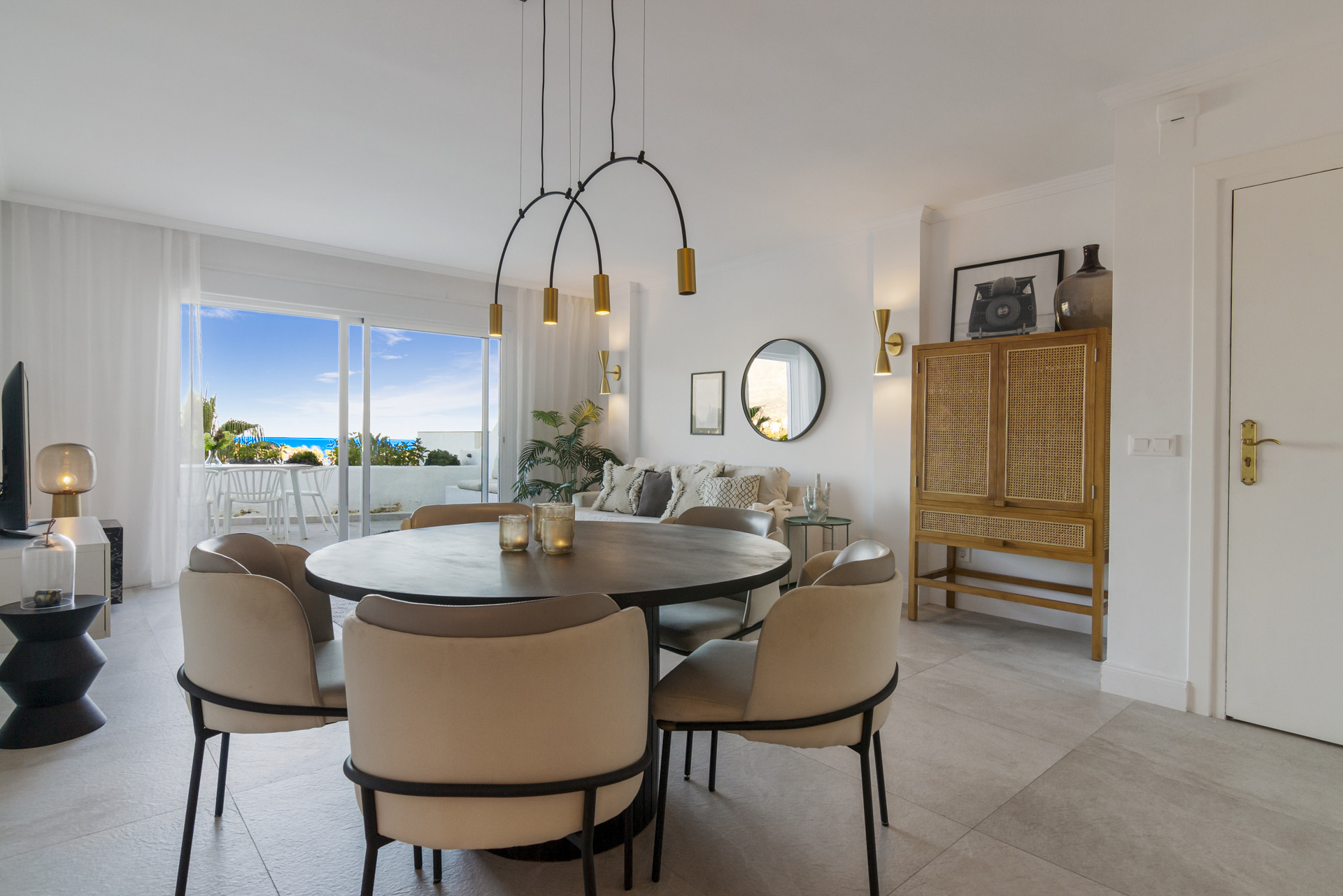 Entering the open plan living area, you are welcomed by the contemporary boho design and décor, and the views over Golf Valley, La Concha Mountain, and the Mediterranean Sea.