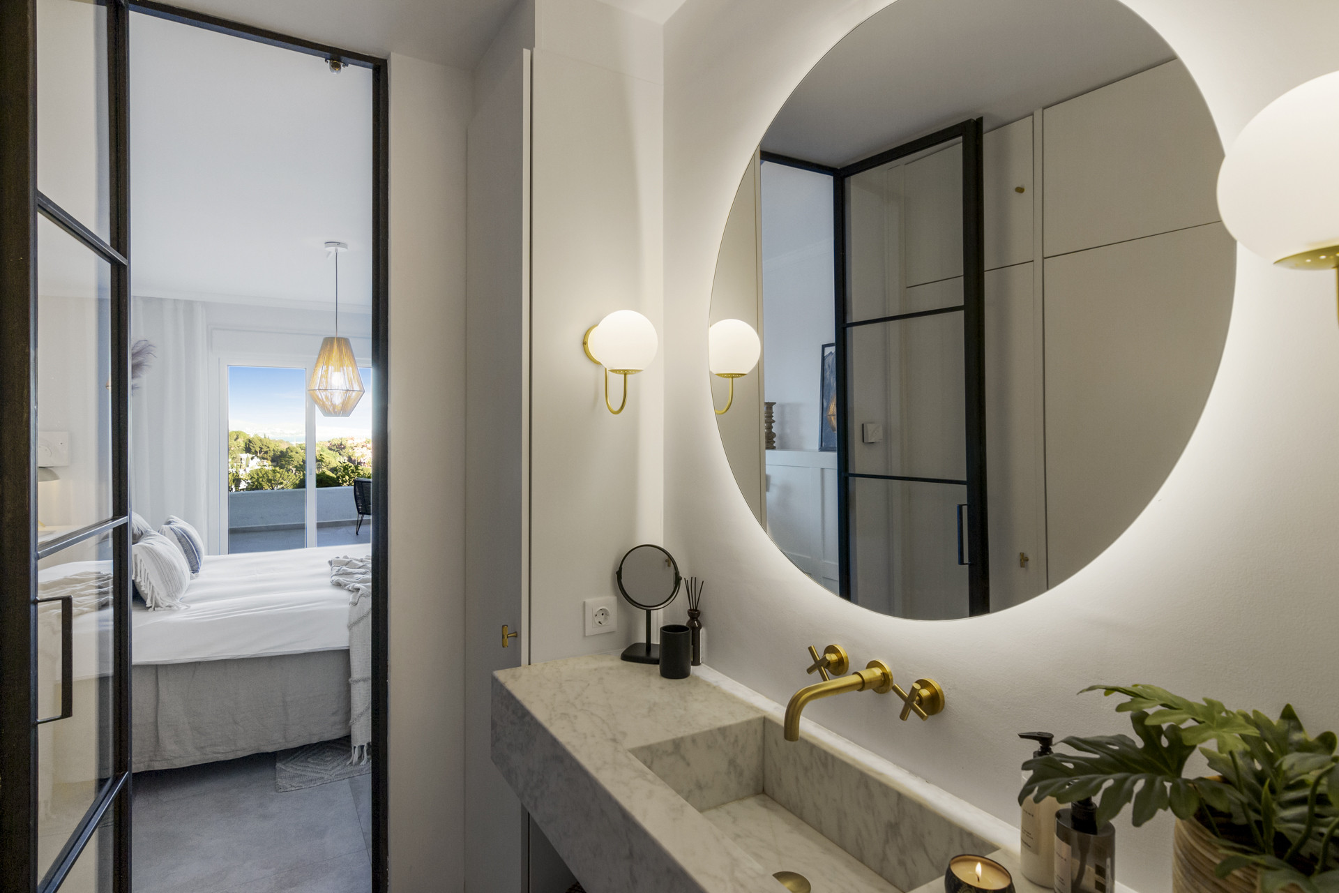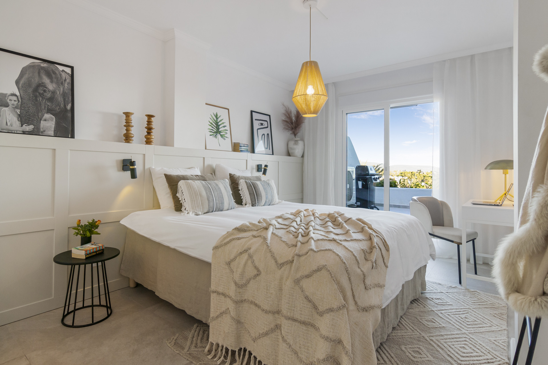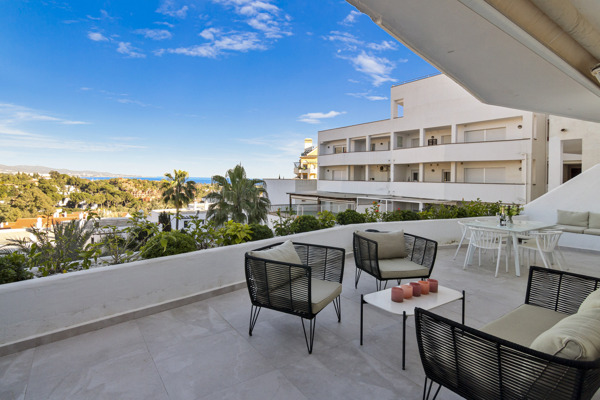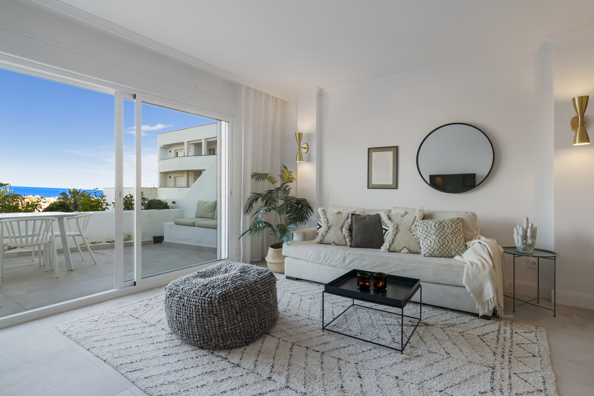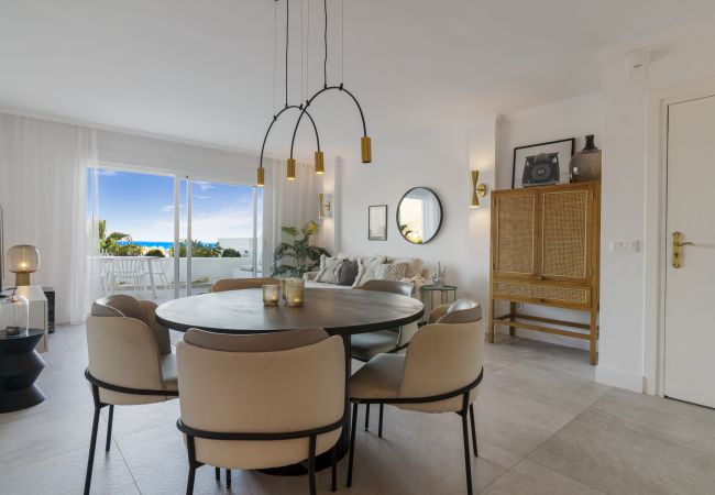 Entering the open plan living area, you are welcomed by the contemporary boho design and décor, and the views over Golf Valley, La Concha Mountain, and the Mediterranean Sea.