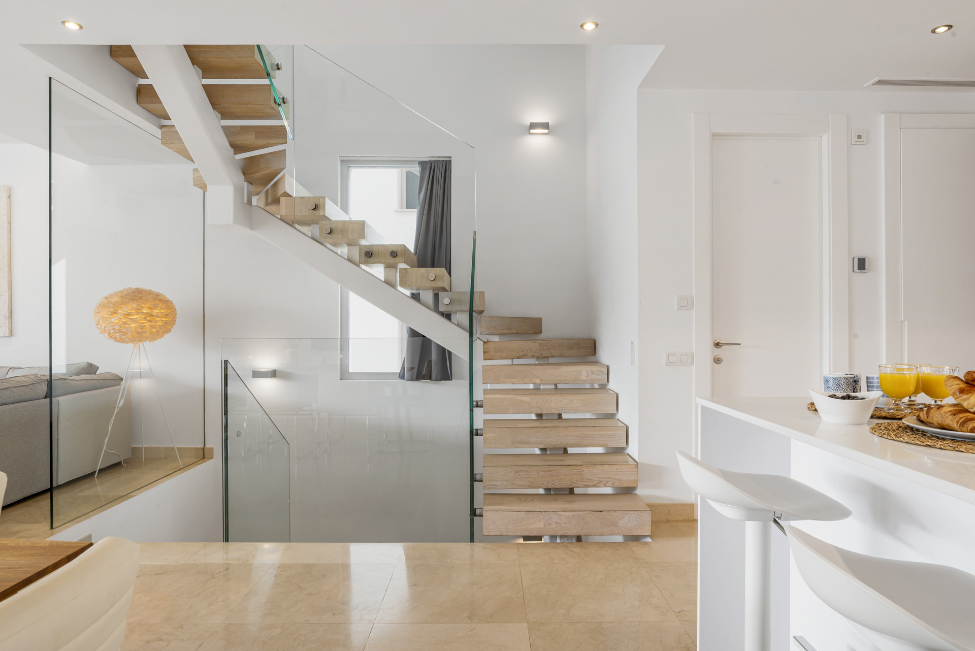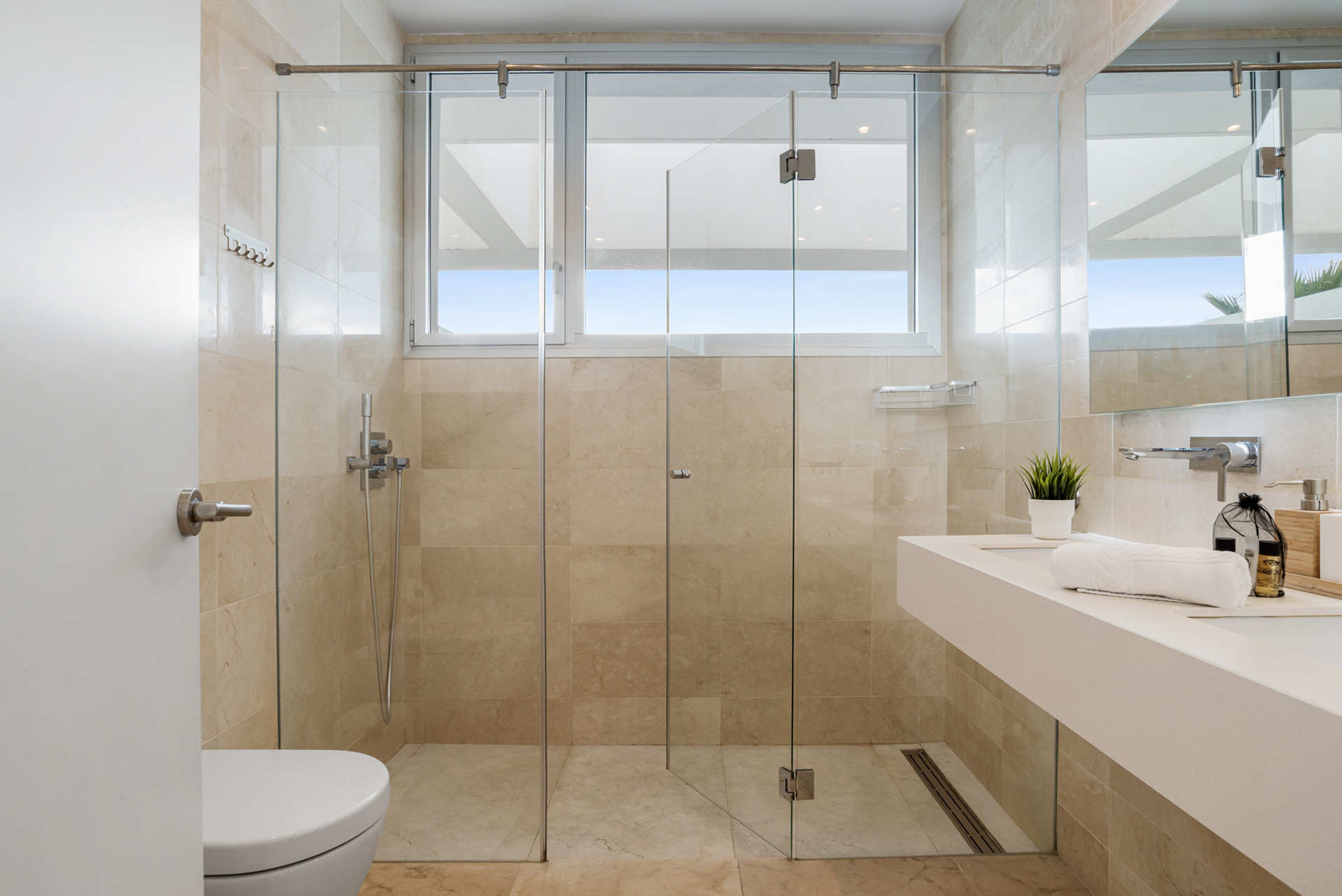 Upstairs there are 3 double bedrooms with fitted wardrobes in each. There is a double room with a 140cm bed, and a separate bathroom with a rain shower. The Master Bedroom has a 160 bed, a walkthrough closet area, an ensuite bathroom with a shower, and access to the terrace. The third bedroom is accessed through the Master Bedroom. It has a 160cm bed and access to the terrace.