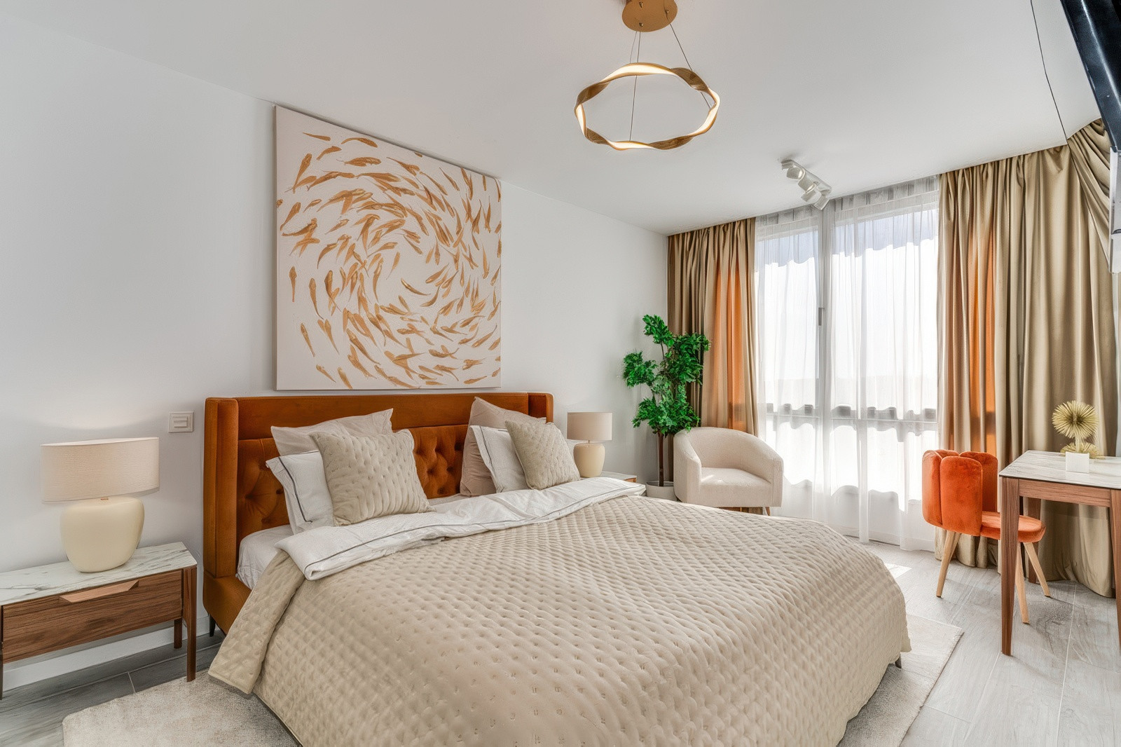 The heart of the home lies in its open-plan living and dining area, where natural light floods through large windows, highlighting the refined finishes and tasteful décor throughout. The kitchen is fully equipped and seamlessly integrated into the space, perfect for preparing meals to enjoy with loved ones. Whether you're looking to relax after a day at the beach or entertain guests, the stylish ambiance of the home makes every moment feel like a retreat.