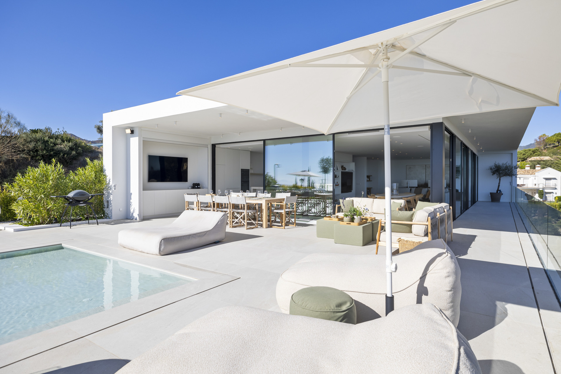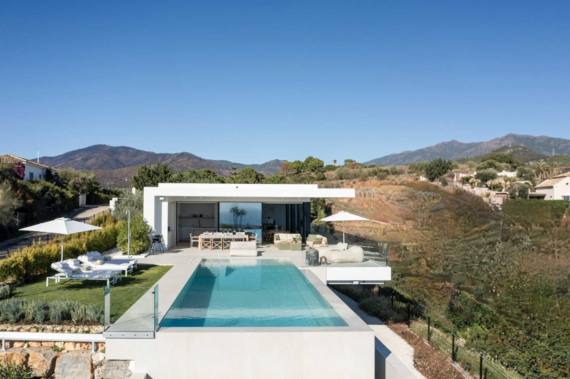 Outside, the villa boasts a striking infinity-edge pool overlooking the hills, with ample sun loungers and shaded seating areas for day-to-night relaxation. The pool can also be heated on request, offering year-round enjoyment. With lush landscaping and total serenity, Villa Imagine is your private escape in one of the Costa del Sol’s most exclusive enclaves—just a short drive from Marbella, yet a world away in feel.