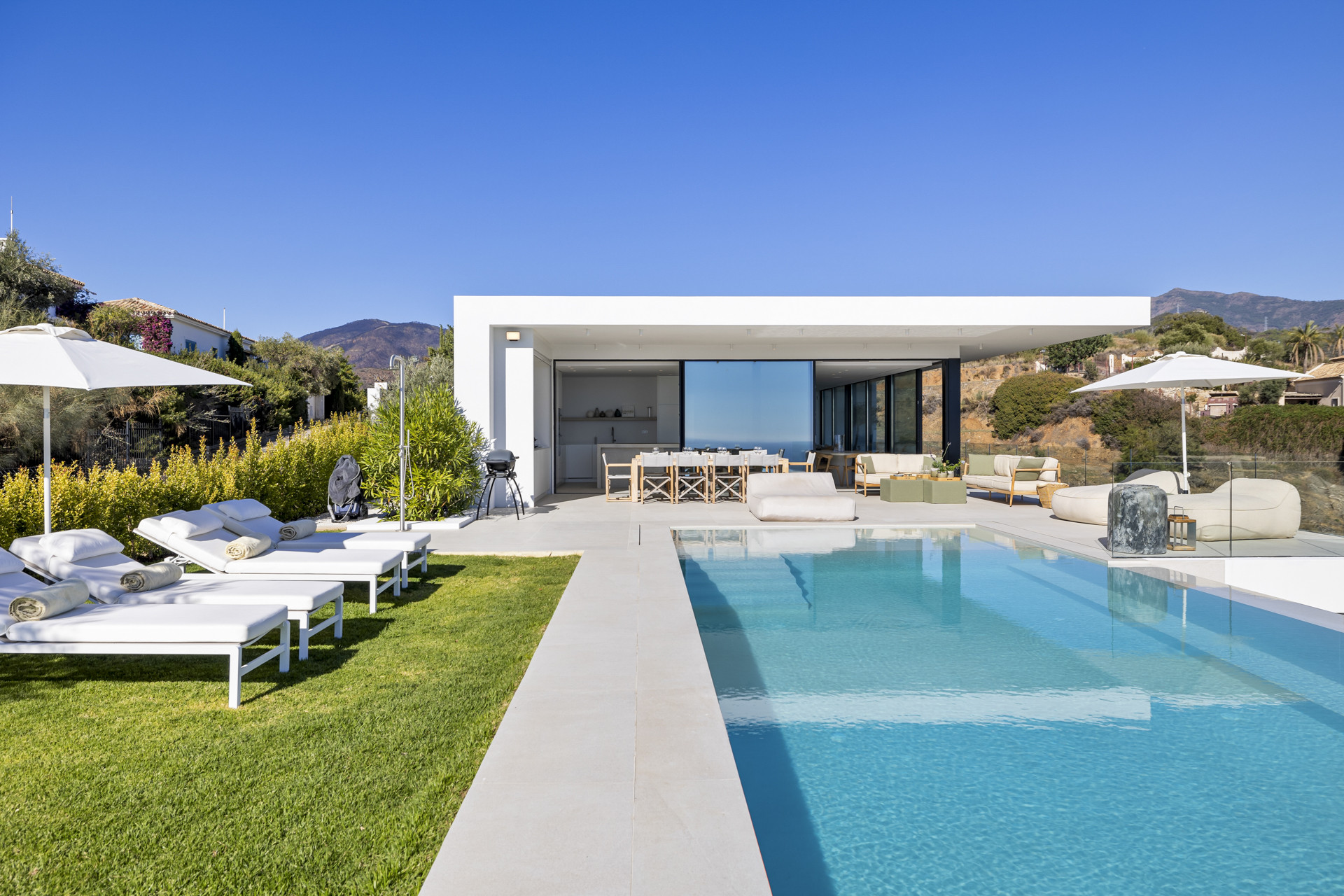 Villa Hakuna Matata – Set within the serene enclave of La Alqueria, this exquisite 4-bedroom villa offers a blend of elegance and comfort, capturing captivating views of the golf course, La Concha mountain, and a glimpse of the Mediterranean Sea. The property’s design emphasizes light and space, with expansive windows framing the scenic landscape and flooding the interiors with natural light.Inside, the open-plan living and dining areas connect seamlessly to a well-appointed kitchen, ideal for hosting or relaxed evenings in. Each bedroom has been crafted as a private sanctuary, offering comfort and tasteful decor with easy access to views or the outdoor spaces.Outside, the villa’s terrace and private pool area provide an inviting spot to unwind, whether enjoying a morning coffee with mountain views or an evening swim. The landscaped gardens further enhance the sense of tranquility, making Villa Hakuna Matata not only a refined retreat but a perfect home to embrace the serene Costa del Sol lifestyle.Please note that we welcome families and couples only, no groups under 30, and no hen or stag parties. Should you fall outside of this category but wish to book nonetheless, please send us an enquiry detailing a bit more about yourself and the group that you will be travelling with so we can request this for you.We look forward to welcoming you!