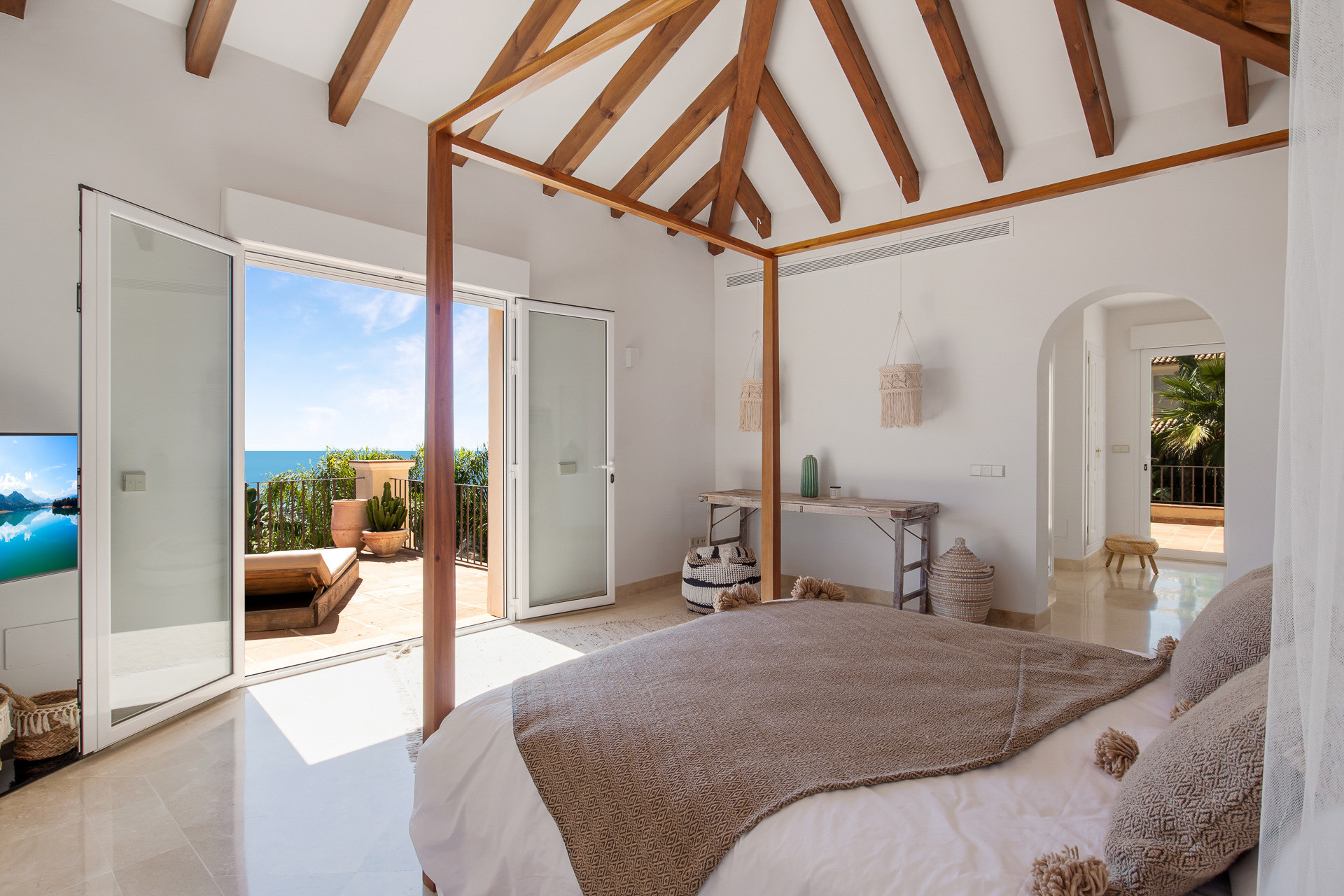 There is one bedroom downstairs and three upstairs. The double ensuite bedroom downstairs has garden views and access to the garden and pool area. Upstairs, the Master (ensuite), twin-room and double bedroom all have access to the upstairs terrace which enjoys breath-taking sea and mountain views. Here you can savour the sunsets relaxing on the comfy lounge furniture.