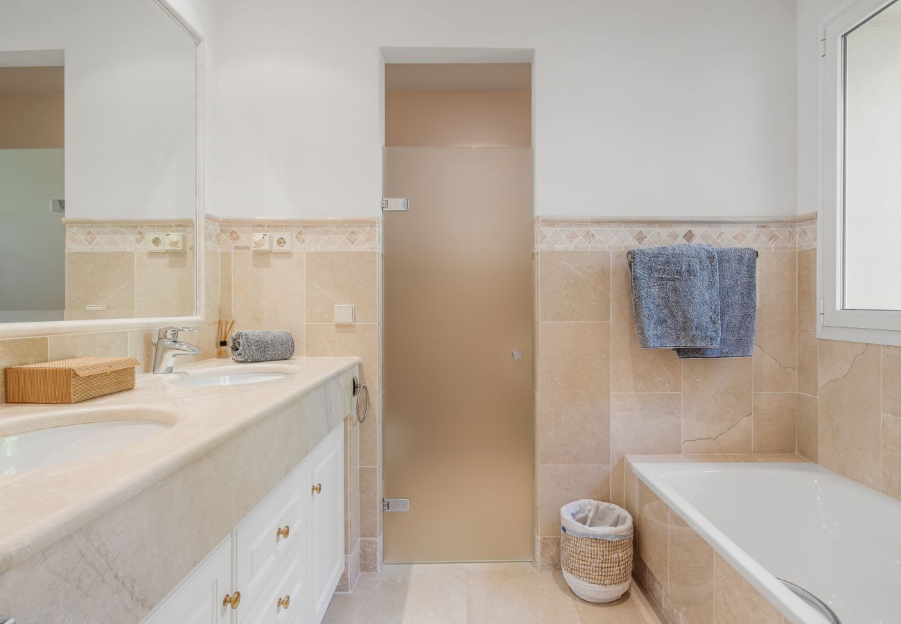 Upstairs you find both a double guest room and the impressive master bedroom with its own private terrace and large en suite bathroom including a walk-in shower and divine bathtub.