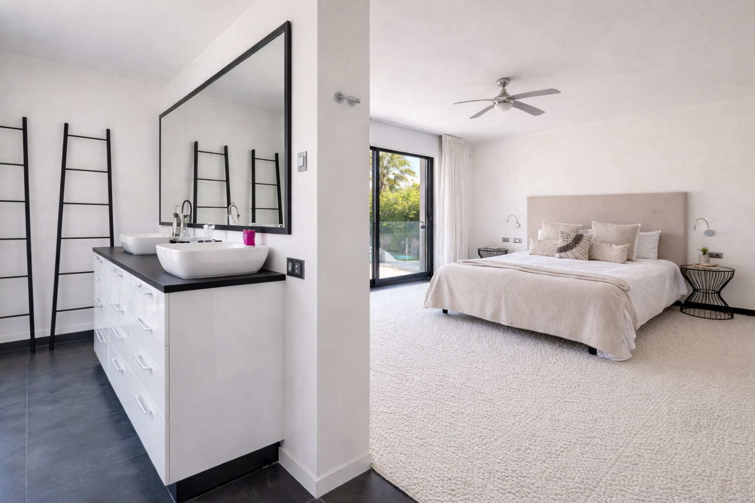 The master bedroom is spacious with a great en suite bathroom and walk-in closet with views of the pool area. In total, there are 5 bedrooms. Another bedroom with en suite bathroom is located in the basement area with direct access to the pool area.